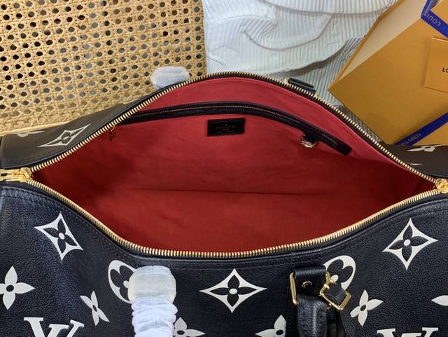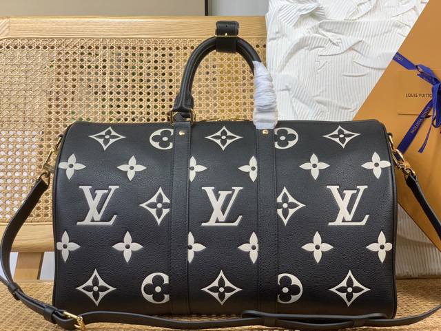 本款 Keepall BandoulièRe 45 取材 Monogram Empreinte 压纹皮革,呈现大号 Monogram 花卉和 Lv 字母的淡雅色彩。皮革侧带、顶部手柄和可拆卸肩带与金属件相得益彰。拉链内袋方便齐整收纳。