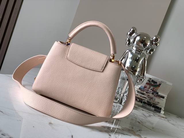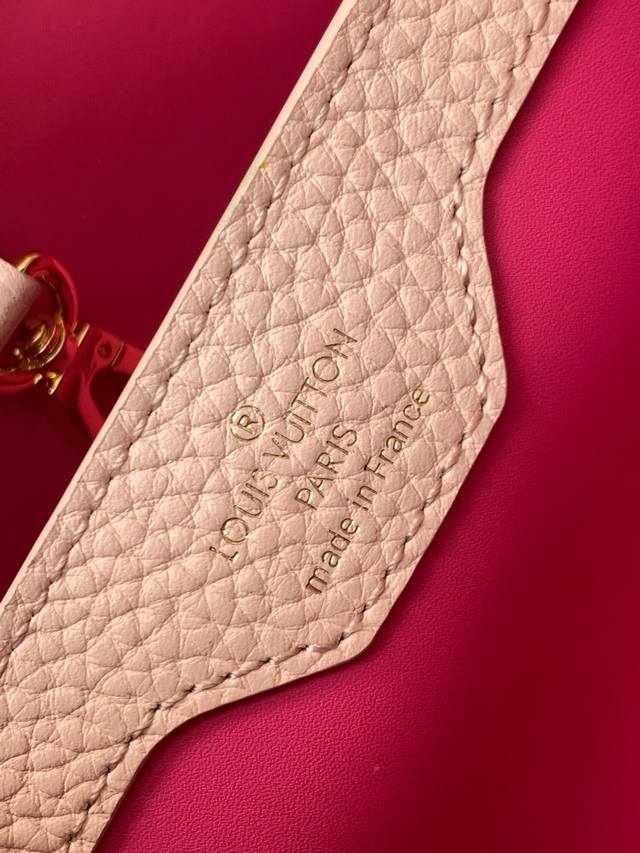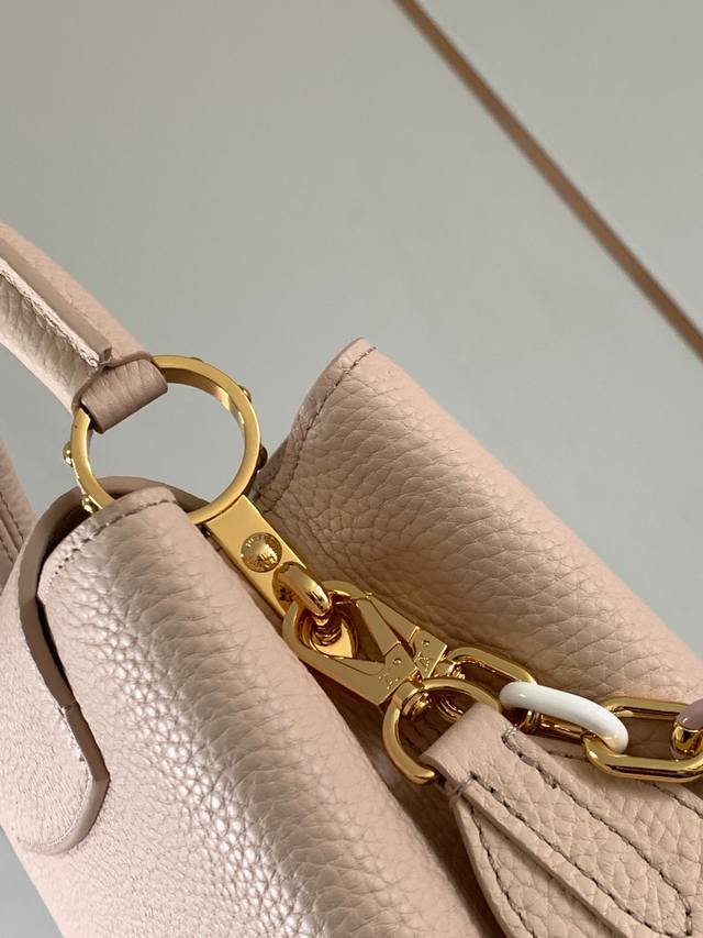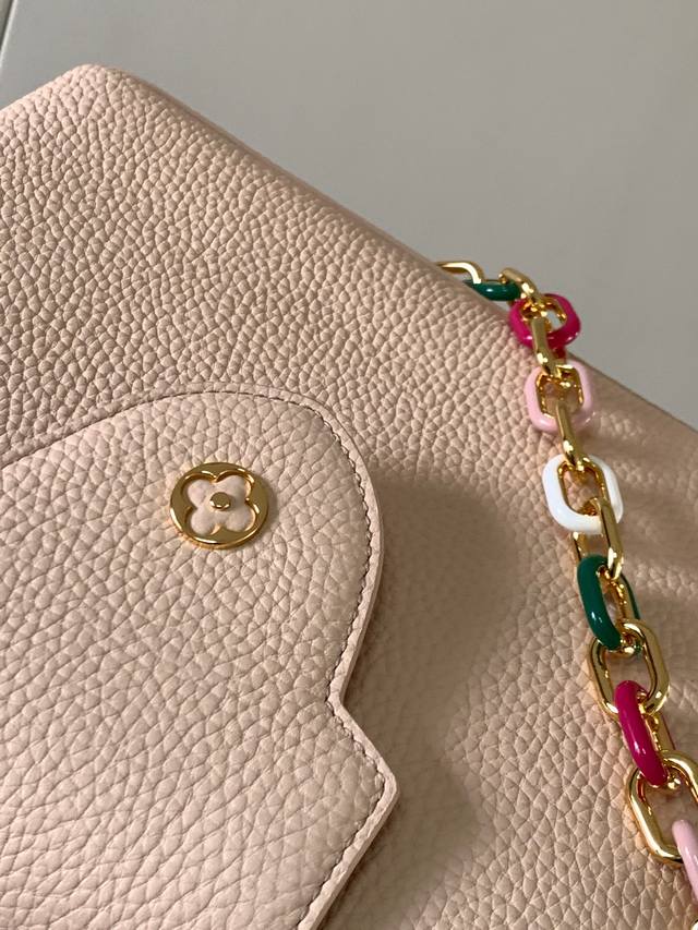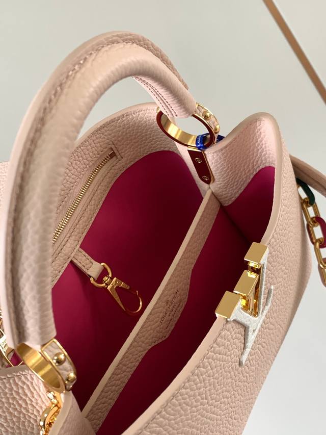 本款 Capucines Bb 手袋取材 Taurillon 皮革,将金属和树脂链环彼此相扣,塑造可拆卸链条,在缤纷妙趣和典雅韵致间随心切换。宽幅肩带和顶部手柄再添多种背携选择。