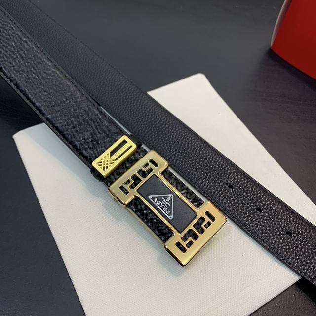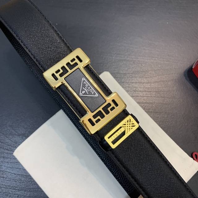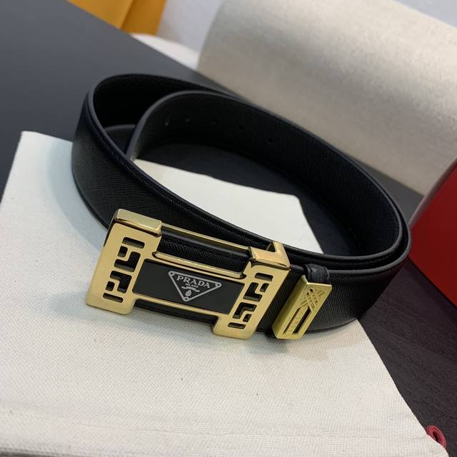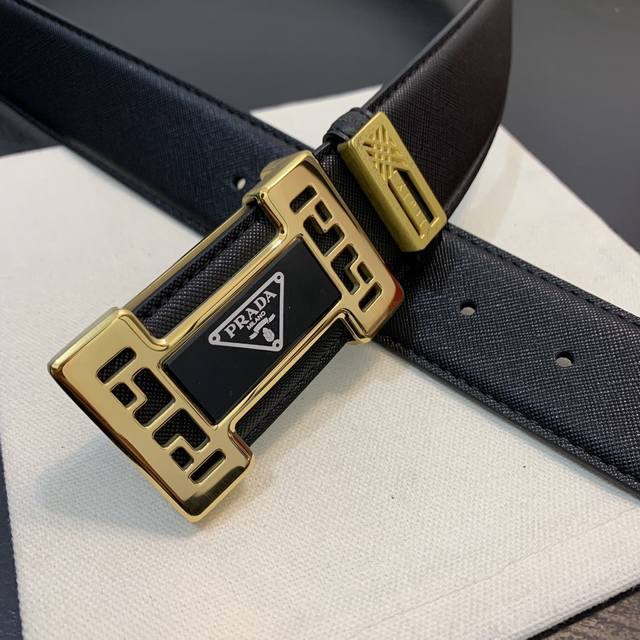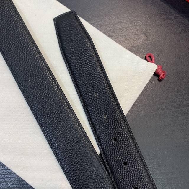/ 普拉达高端私货专供,正版开模 镶钻纯钢扣。此款腰带采用十字纹搭配荔枝纹底皮带身 修边新款精密电镀标志性五金搭扣 宽度3.8Cm实物拍摄,品质保真
