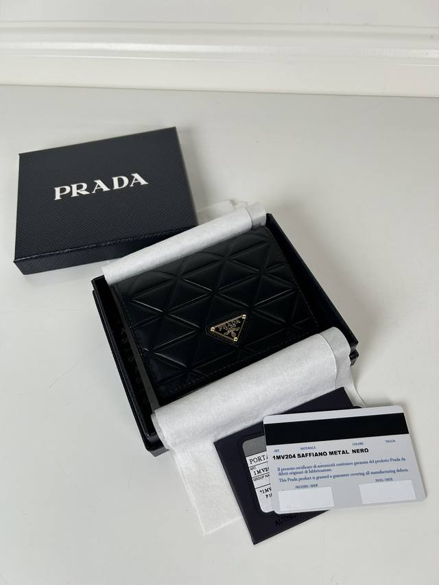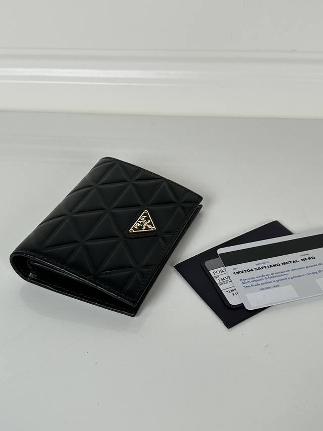 P家最新三角微标卡包,型号1Ml047,Saffiano十字纹皮与进口小牛皮的完美结合,尺寸8×10Cm,一个票据隔层,九个卡槽,拉链式隔层...