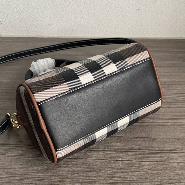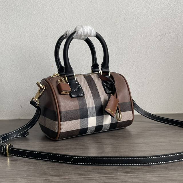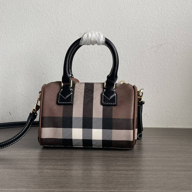 / 特惠 B家迷你枕头包,立挺设计,装饰 Burberry 格纹,搭配皮革裹覆挂锁和行李吊牌。18.5 X 11 X 12Cm.顶部皮革提柄.可拆可调式肩背带.拉链