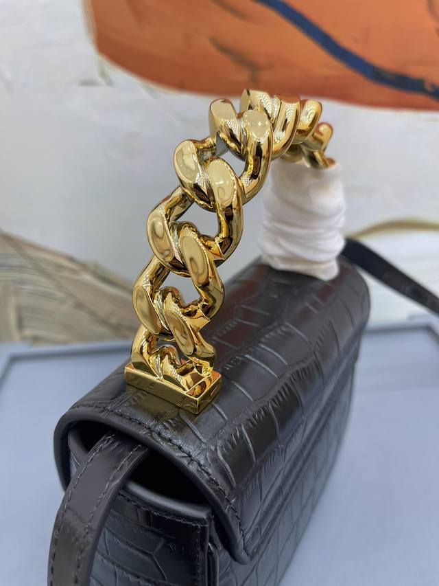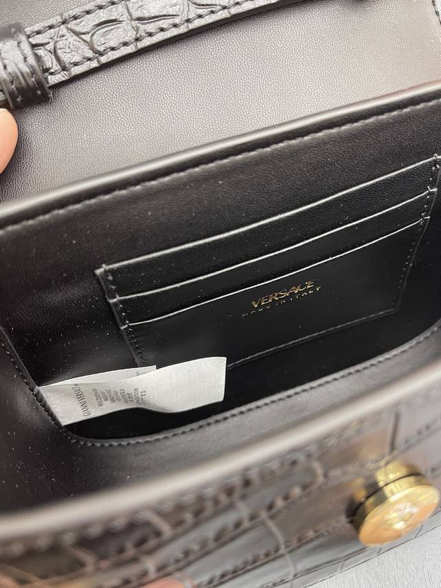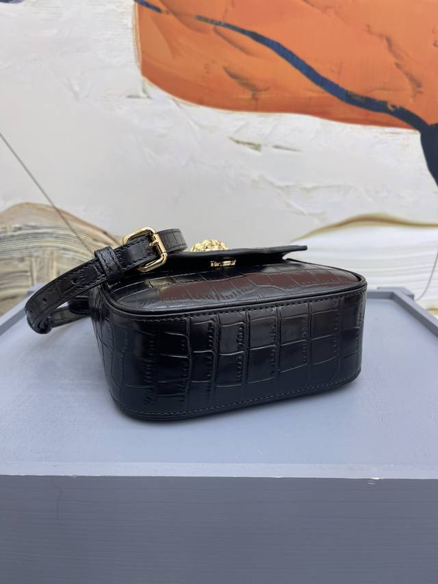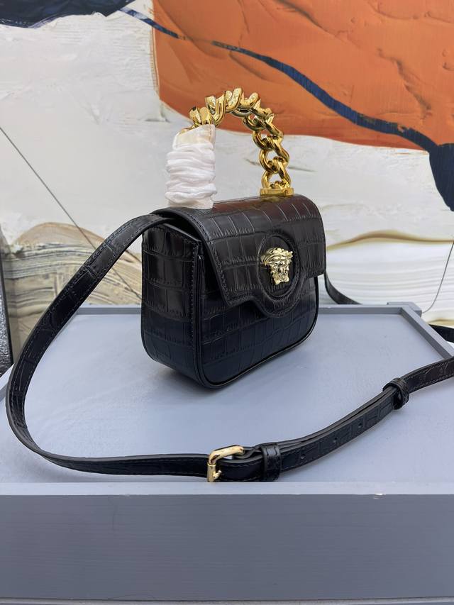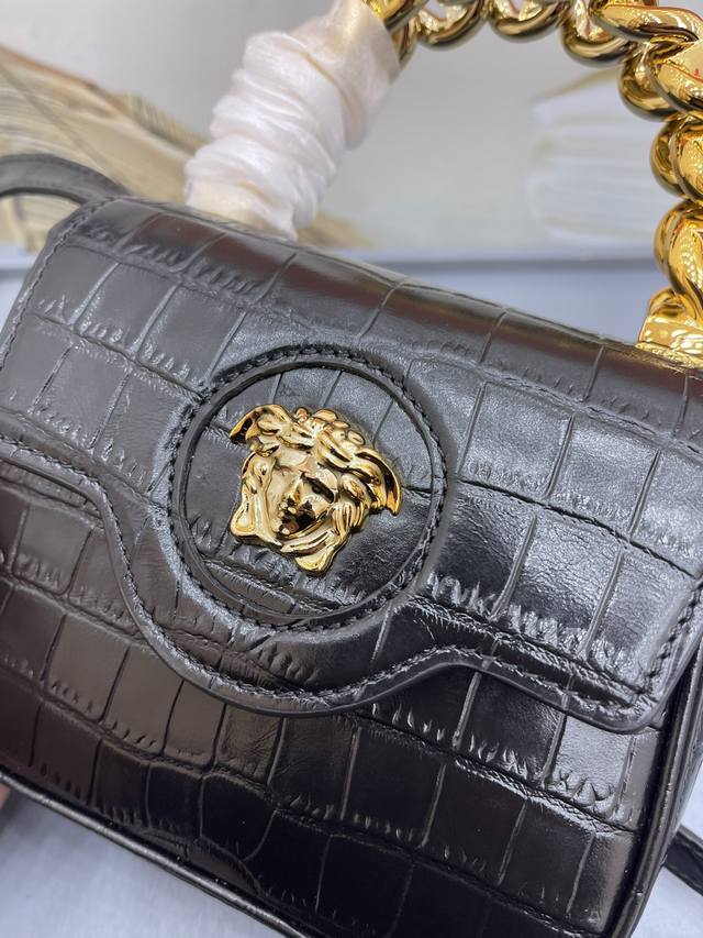 Versace 向小女王包早秋 Say Hi ~摩登转角,邂逅丹宁美杜莎!涌动新潮态度,金色醒目的美杜莎板式与手柄为时髦加分。中央 Medusa 颇具辨识度。该设计配有固定链式顶部提手,也可选择可拆卸、可调节肩带。三个内部卡槽位。型号1066尺寸:16X6X12Cm
