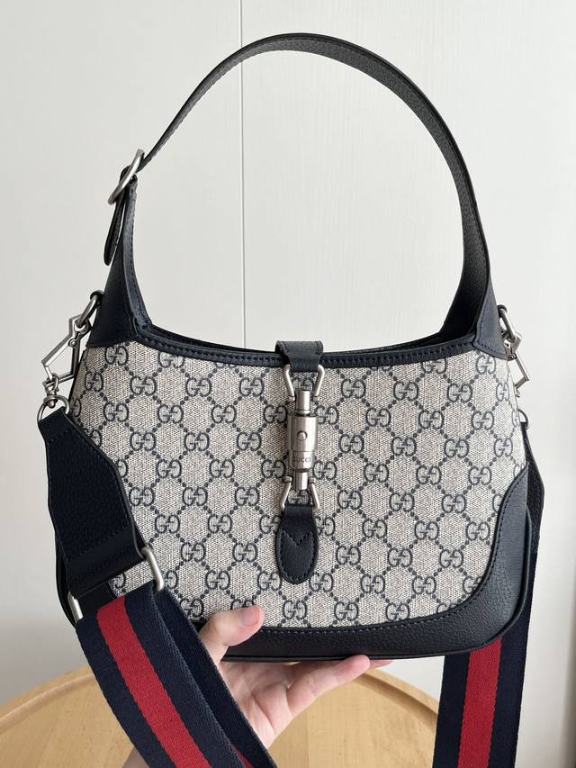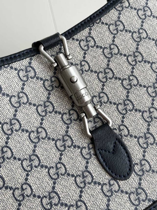 古驰Aria-时尚咏叹调 系列运用现代手法焕新演绎经典。Jackie 1961系列焕新推出质感柔软、结构灵活的长方形托特包。典藏设计搭配通体Gg图案和条纹织带等标识细节,精巧配饰致敬Gucci历史传承。这款小号手袋采用黑色皮革滚边,搭配该系列标志性的金色调推入式锁扣配件。黑色和象牙白色Gg丹宁提花面料。黑色皮革滚边。