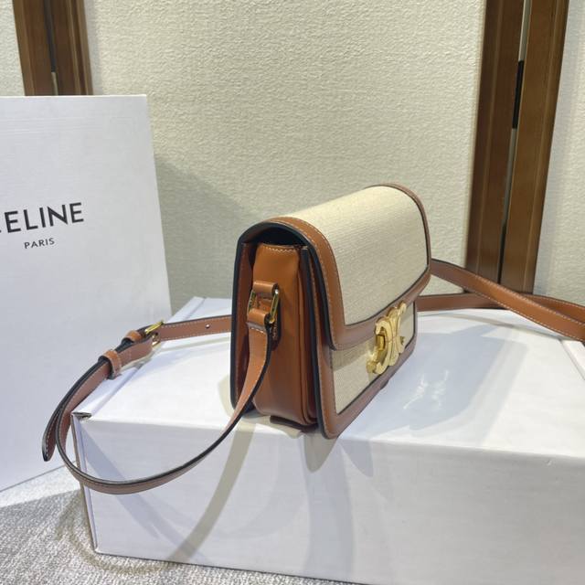 Celine 小号Celine Triomphe提花帆布和小牛皮小号手袋 新设计凯旋门回旋扣 金色金属件 斜挎和肩背 内侧拉链口袋和扁平口袋 !可调节皮革肩带长17英寸 42厘米 尺寸 18.5X14X6厘米 款号188882 配全套包装