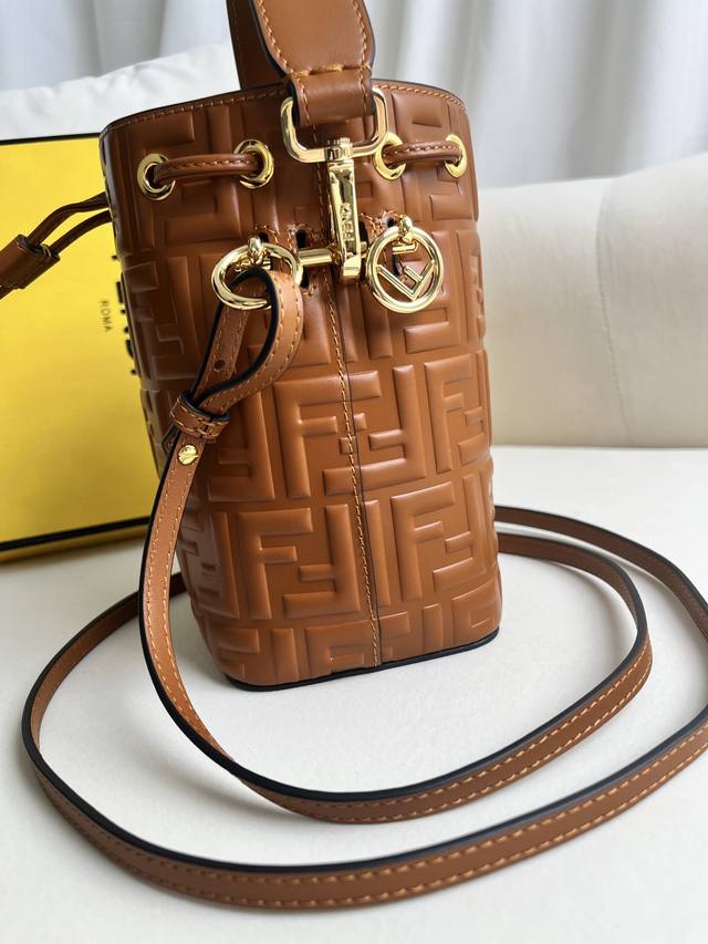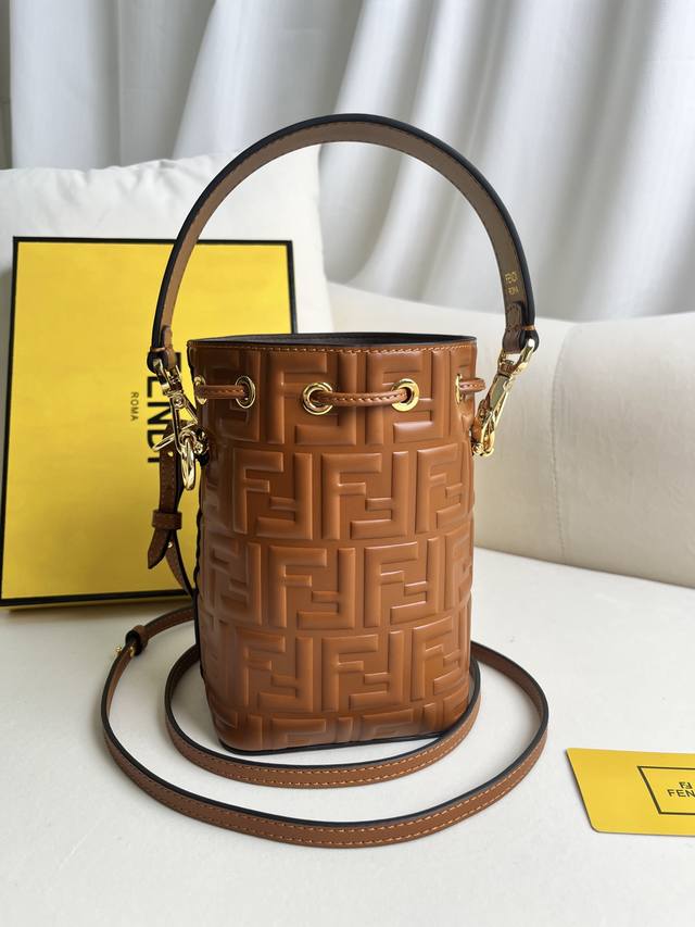 Mon Tresor小号水桶手袋,配有抽绳和Fendi金属标志装饰。配一长一短两条可拆卸肩带,可手提、单肩背或斜挎。浅兰小牛皮材质。黑色手绘凸纹Ff标志性印花图案。金色金属件。意大利制造
