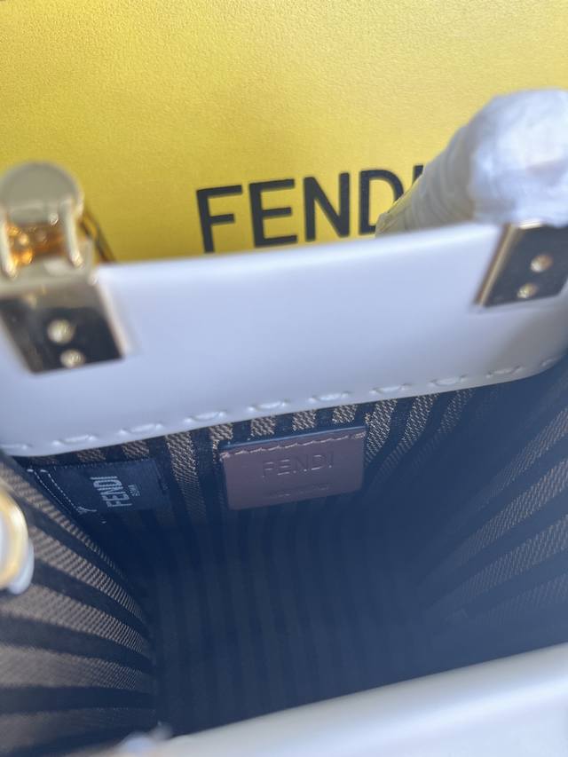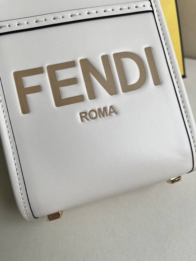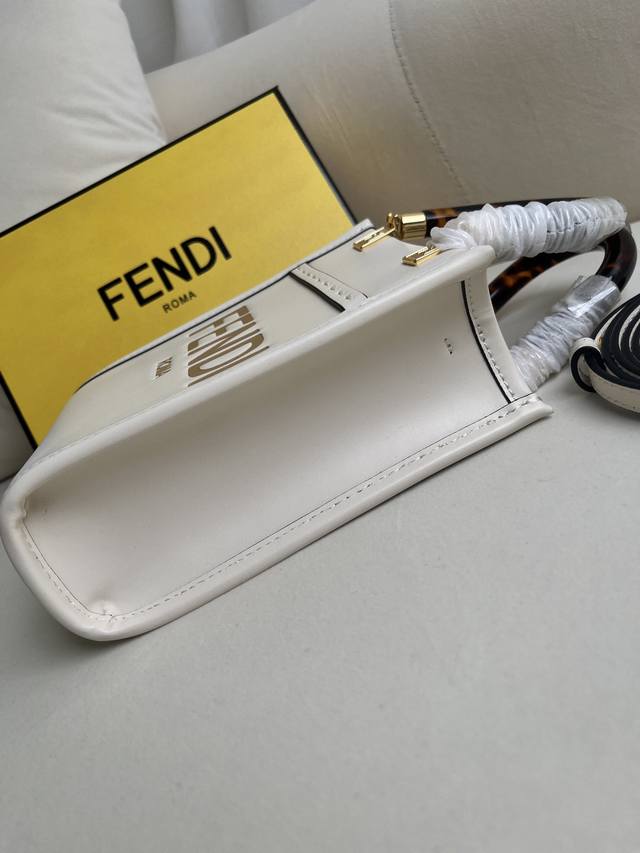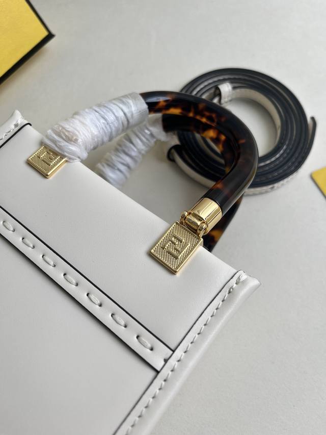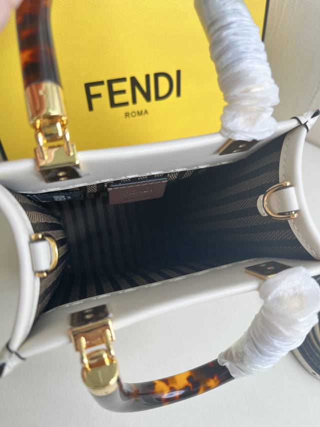 Sunshine迷你手提袋 棕色皮革迷你手袋更多细节 Sunshine棕色皮革迷你手提袋,饰有烫印“Fendi Roma”字样和硬质有机玻璃提手,呈现玳瑁效果。配备带衬里内部隔层,点缀同色系皮革饰边和金色金属件。采用两个提手和可调节可拆式细肩带,既可手提,又可肩挎。意大利制造 材质:100%小牛皮,100%聚甲基丙烯酸甲脂,内里:48%锦纶,46%涤纶,6%树脂 深度: 6.5 长度: 13 高度