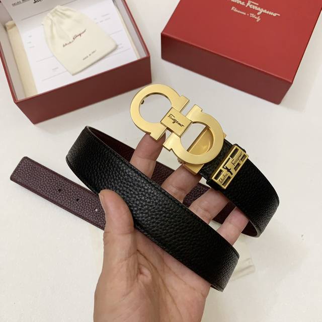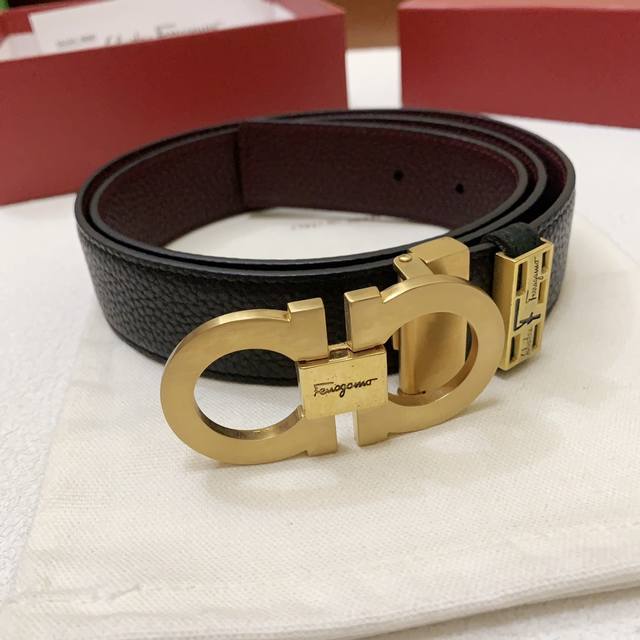 配正版包装代购客户专供货, 菲拉格慕同步双面带身,黑色配酒红色对版荔枝纹小牛皮,高端皮料定制,请看图片认细节, 媲美正品无压力 好货上手即知,宽度3.4Cm 高