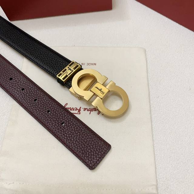配正版包装代购客户专供货, 菲拉格慕同步双面带身,黑色配酒红色对版荔枝纹小牛皮,高端皮料定制,请看图片认细节, 媲美正品无压力 好货上手即知,宽度3.4Cm 高清实拍大图