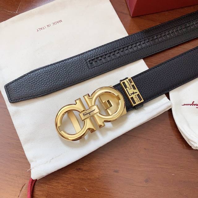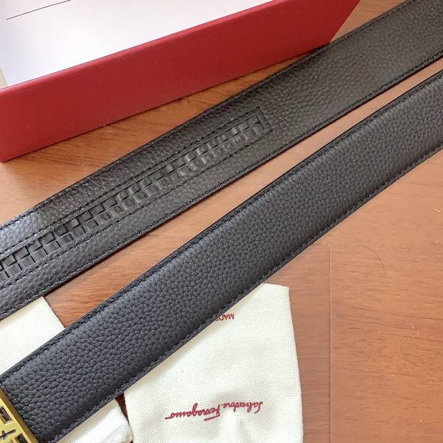 菲拉格慕新款 精品自动扣系列 外穿式 宽度3.5Cm 进口头层牛皮 精品五金搭配双面荔枝纹牛皮腰带 长度可自由裁剪
