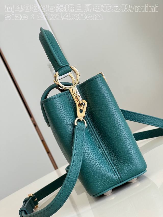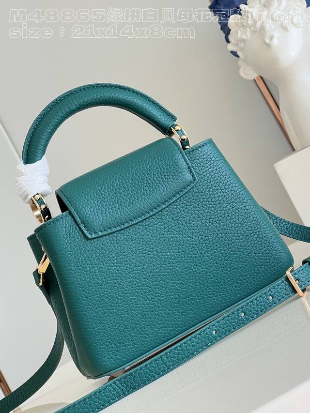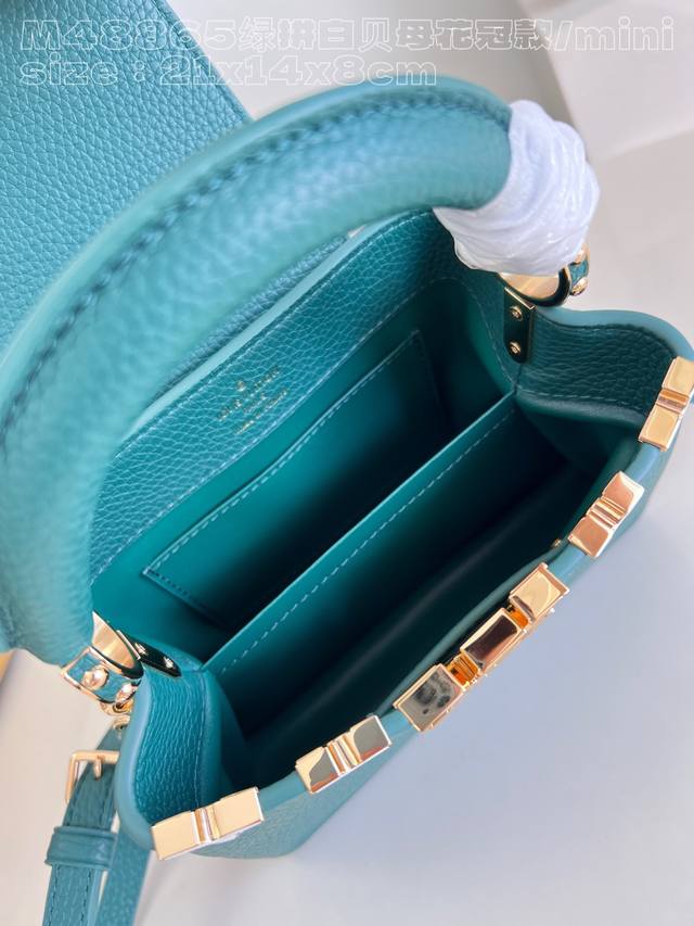 特级原厂 独家实拍 M48865绿拼白贝母花冠款 迷你 Capucines 迷你手袋 法国进口小牛皮,闪亮的金属饰件,特有的Capucines搭盖既可收入包内展