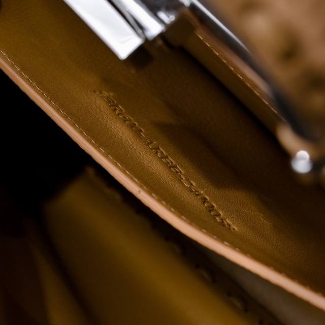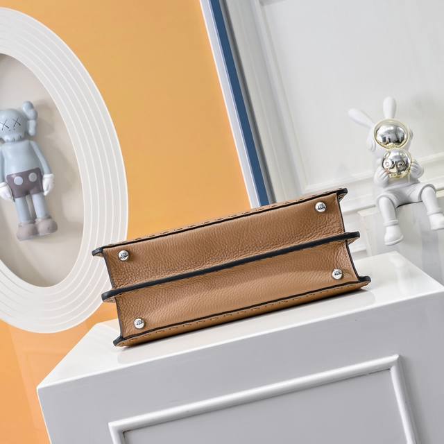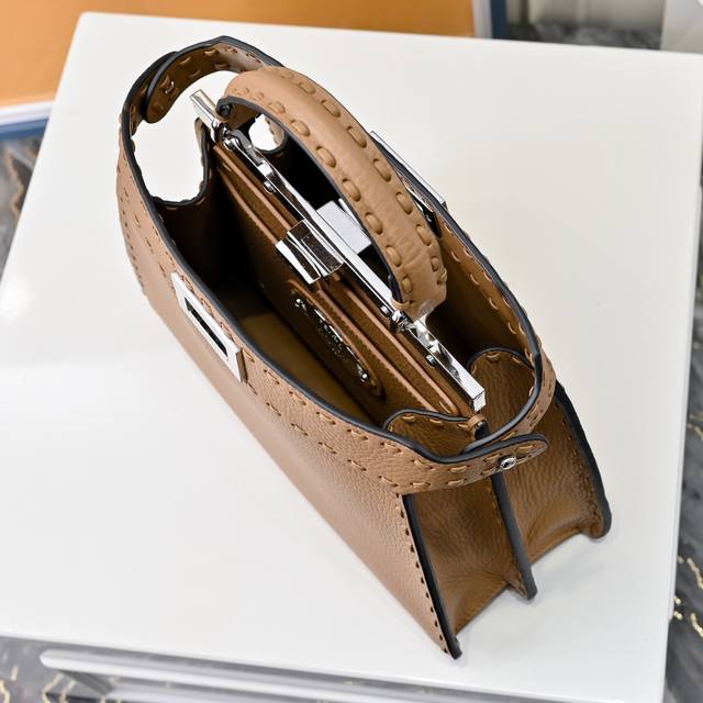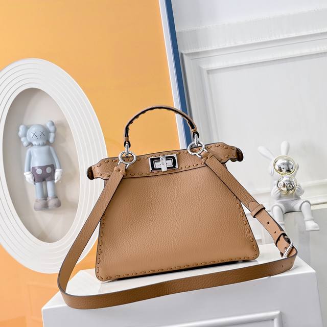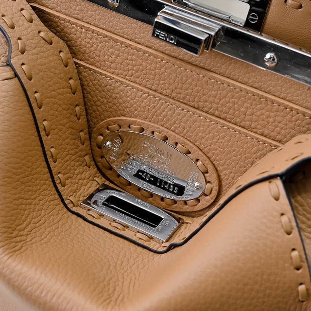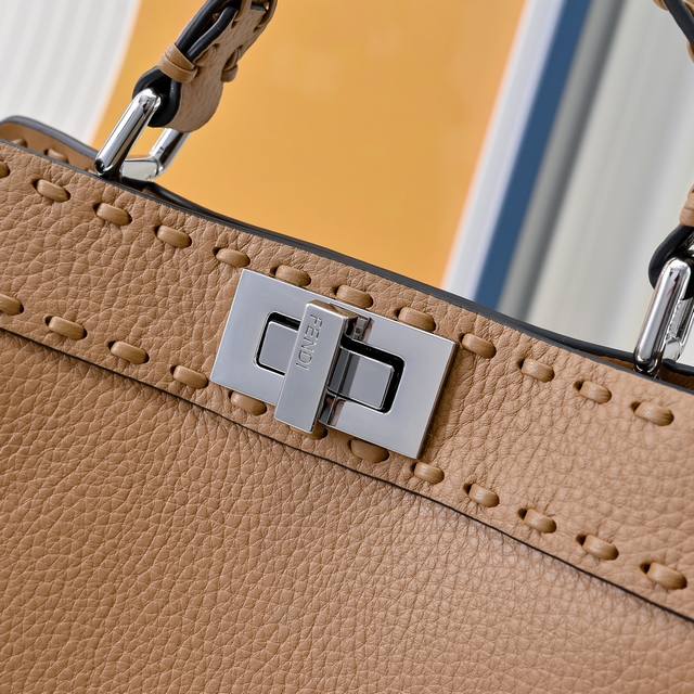 细节:黑色手缝,Peekabooiseeu中号手袋,荔枝纹小牛皮材质,两侧缀以经典的扭锁,软纳帕皮革衬里,两个隔层由硬质隔板隔开,配有系扣内部口袋和金色金属件。手袋配有手柄和可调节、可拆卸式肩带,精緻又耐看的包包