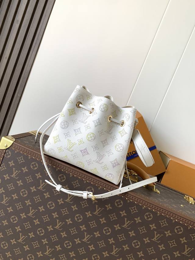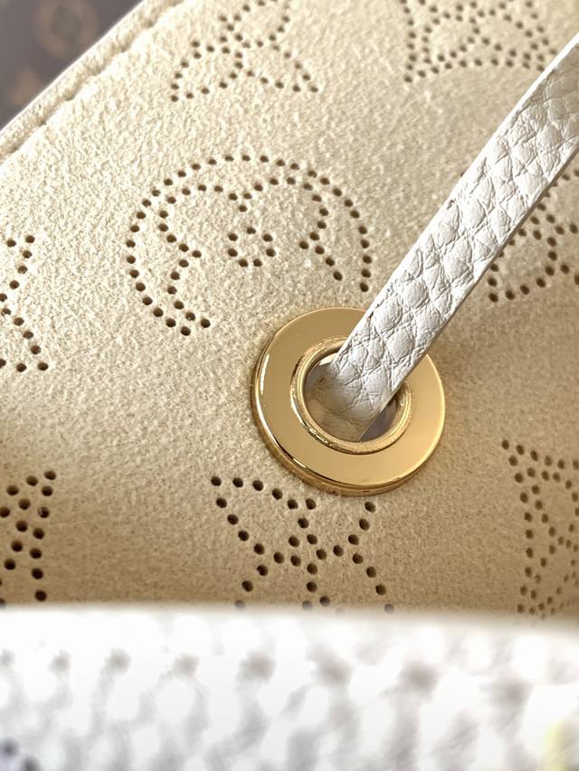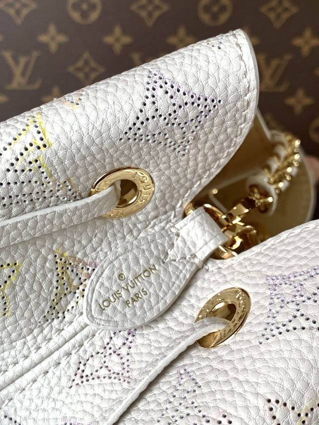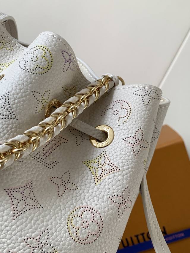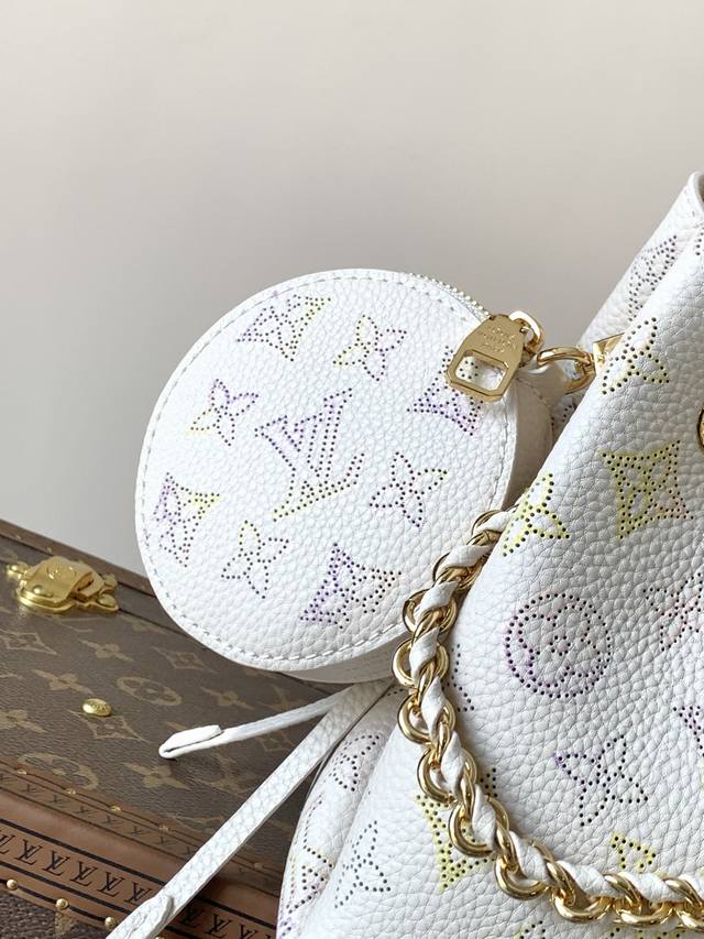 本款 Bella 手袋出自 Dream 系列,以镂花皮革呈现 Monogram 穿孔图案,再借水彩效果映现细腻色彩对比。可拆卸编织链条等金属件点亮精巧构型,圆润零钱袋确保齐整收纳。