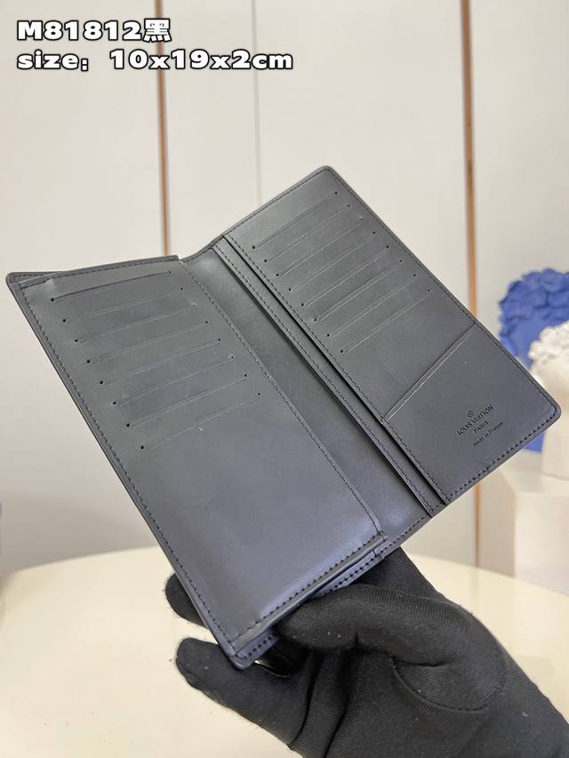 p300 顶级原单【独家实拍 M81812黑】全新 Lv Aerogram Brazza 钱夹着重粒面牛皮革的细腻质感,再以金属 Lv 字母低调烙印身份。隔层和卡位可容纳纸钞、文件和硬币,与 Lv Aerogram 系列手袋搭配相宜。Size:10X19X2Cm C