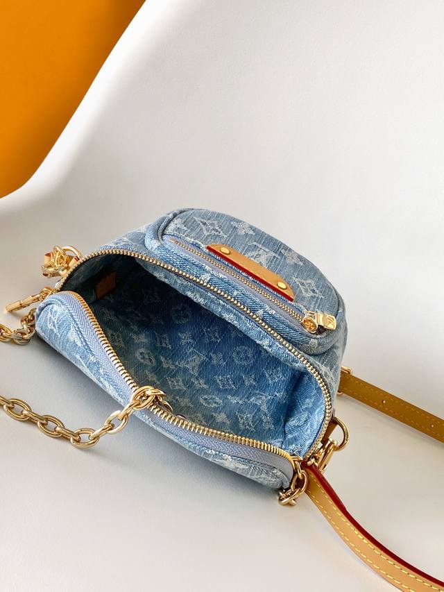 M83353 胸包 斜挎包 本款 Mini Bumbag 手袋为丹宁布织就 Monogram 图案,经漂白和砂洗后呈现复古风范。潮流构型设有拉链主隔层和拉链前袋,后者点缀路易威登压纹皮革标签。链条和可调节肩带均可拆卸,实现多种背携方式