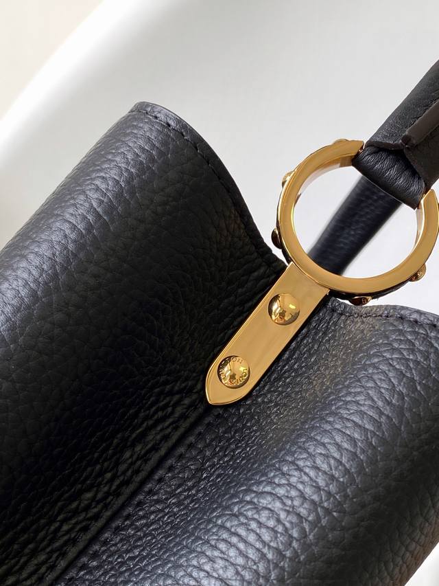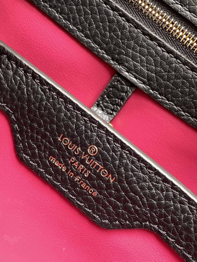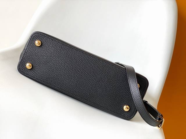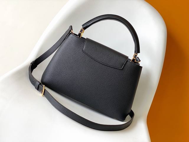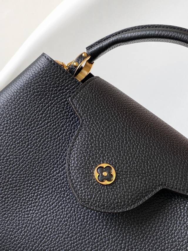 原厂皮 配刺绣防尘袋 1854 年,路易威登于巴黎卡普西纳街开设门店,随之命名的 Capucines 手袋于 2013 年问世。全粒面 Taurillon 皮革材质搭配翻盖:外置显露 Monogram 花卉,内置呈现皮革包覆 Lv 字母。轻盈包身确保整日背携,可脱卸肩带实现手持、肩背或斜挎。31.5 X 20.0 X 11.0 厘米 长 X 高 X 宽