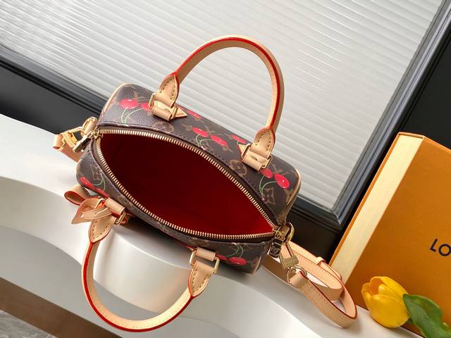 动态163C芯片 顶级原单加强版 M13094樱桃 本款 Speedy BandoulièRe 手袋取材经典 Monogram 涂层帆布,以路易威登 X 村上隆复刻系列的甜美樱桃图案点亮潮流姿彩。考究皮革构筑 Toron 顶部手柄、可拆卸肩带和 Lv X Tm 钥匙包,精巧尺寸可轻松容纳手机和长款钱夹等日常所需。13.5 X 12 X 20.5 厘米 高 X 宽 X 长度 Fd.700