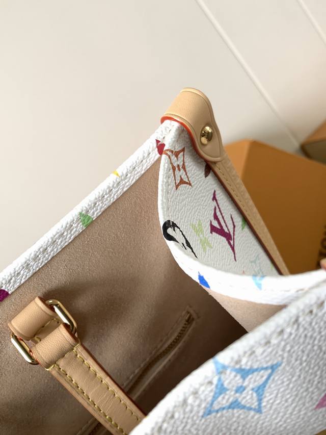 路易威登 X 村上隆再版系列以灵动笔触演绎 Onthego 中号手袋。缤纷 Monogram 帆布包身、牛皮革饰边和 Lv X Tm 钥匙包彰显考究格调,莹亮包角回溯路易威登传统行李箱设计,肩带和顶部手柄实现多种背携方式。