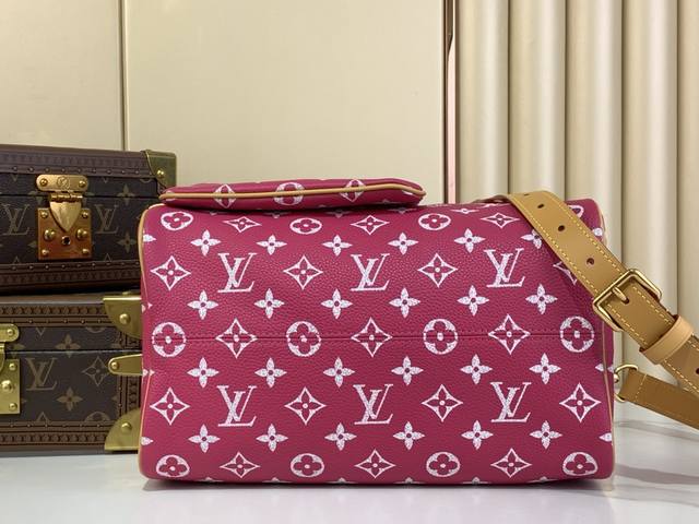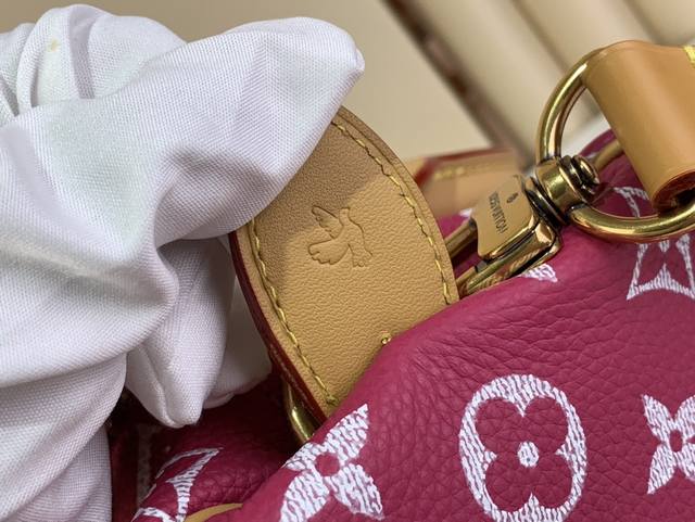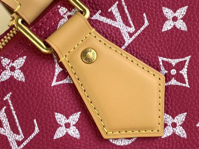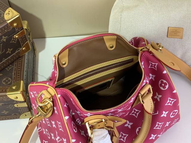本款 Speedy p10 Bandouli Re 30 Monogram 皮革手袋以柔软牛皮革传递华贵质感 Monogram 印花临摹帆布上的Monogram 元素 抛光金属件 羊皮革内衬与内置标牌彰显创意总监pharrell Williams 对考究细节的专注