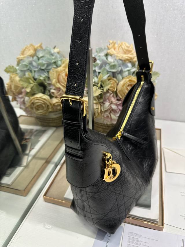 正品级 ,高版本 中号 Dior Voyage 手袋 褶皱黑色 这款 Dior Voyage 手袋是二零二六早春成衣系列新品,融合柔软线条和高雅的细节,打造协调的廓形。采用黑色褶皱牛皮革精心制作,饰以扁平超大藤格纹缉面线,焕新演绎 Dior 的经典图案。柔软廓形搭配金色饰面金属 D.I.O.R. 吊饰和匠心打造的皮革点缀提升格调,令造型更加挺阔,主隔层则采用安全实用的双向拉链开合。中号款式,顶部手柄搭配可调节搭扣,可肩背,是日常造型的理想良伴。 双向拉链开合 D.I.O.R. 吊饰 可调节顶部皮革手柄,搭