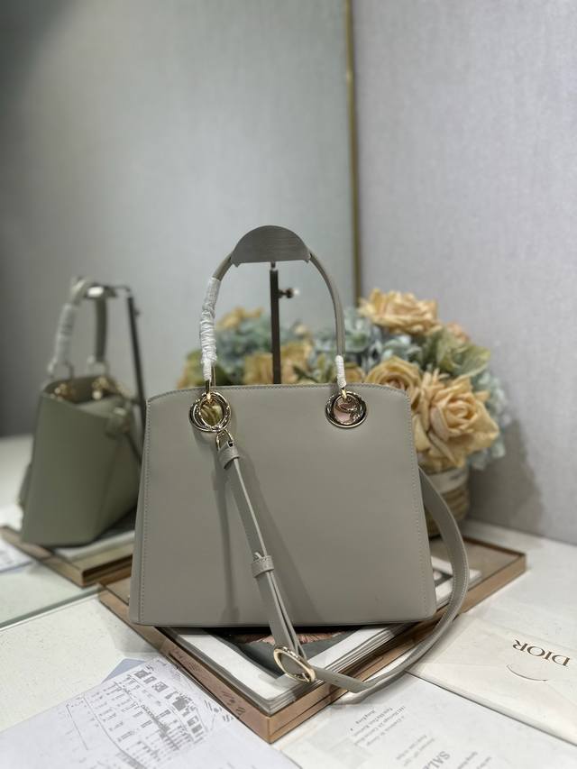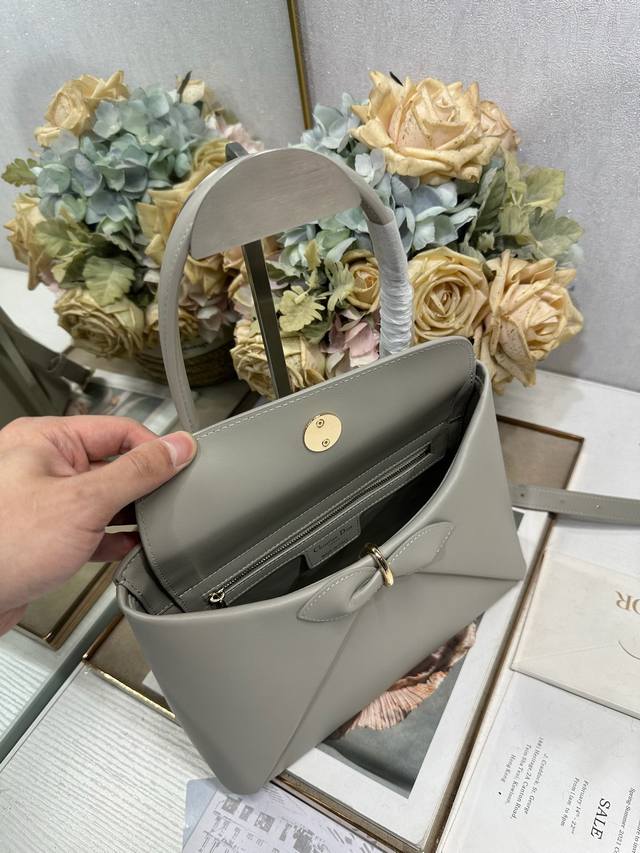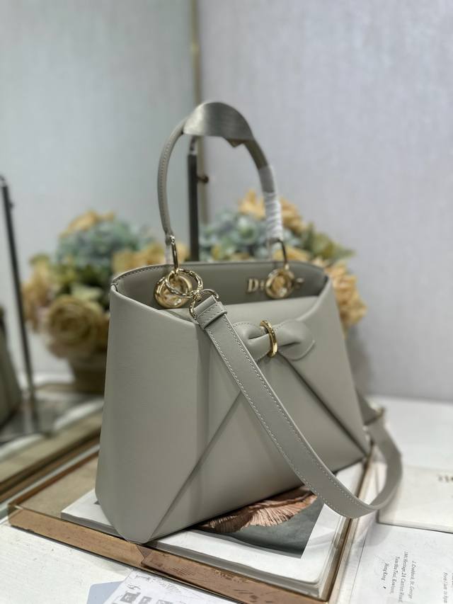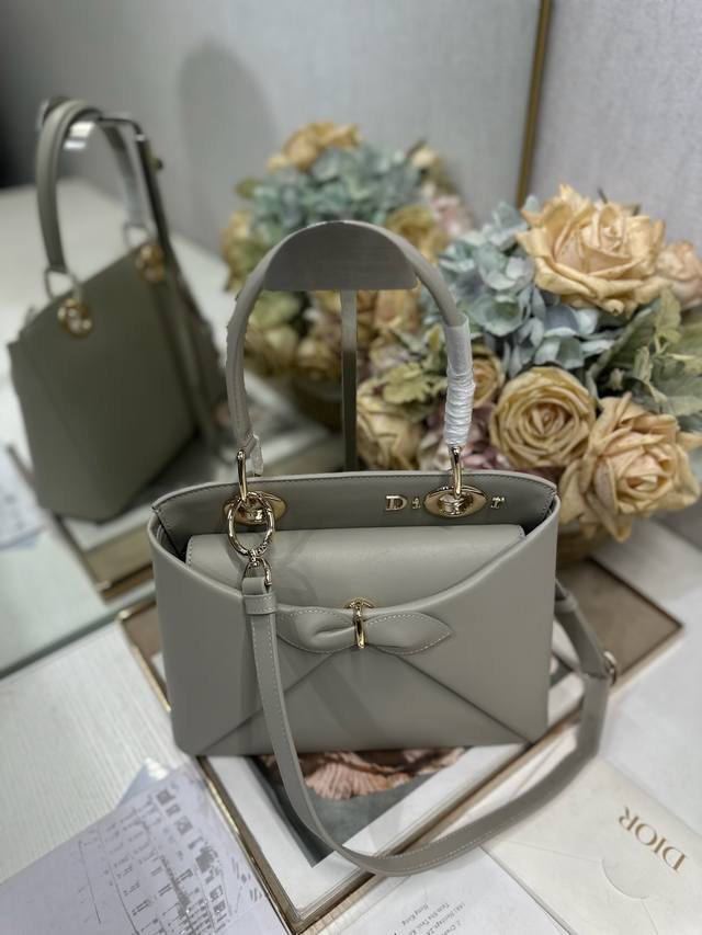 正品级 DDD Dior 2026 春夏新品#蝴蝶结手提包 灰色 DDD 新设计的轮廓与造型,配色 丰富,适配多人!在夸张与优雅之间恰到好处!它的设计灵感源于迪奥先生设计的 Cigale礼服~立体的梯形包身+单手柄,造型自带优雅大气的腔调。包包的外观比较低调,几乎没有什么明显的大Logo。离近点再看,才发现原来Anderson把Dior字母Logo和包包提手的圆孔融合到了一起。 DDD 包包既有辨识度,也完全不是张扬挂的,整体散发着那种不动声色的高级感!值得一提的是,这款包还搭配了一条皮质长肩带。尤其出门