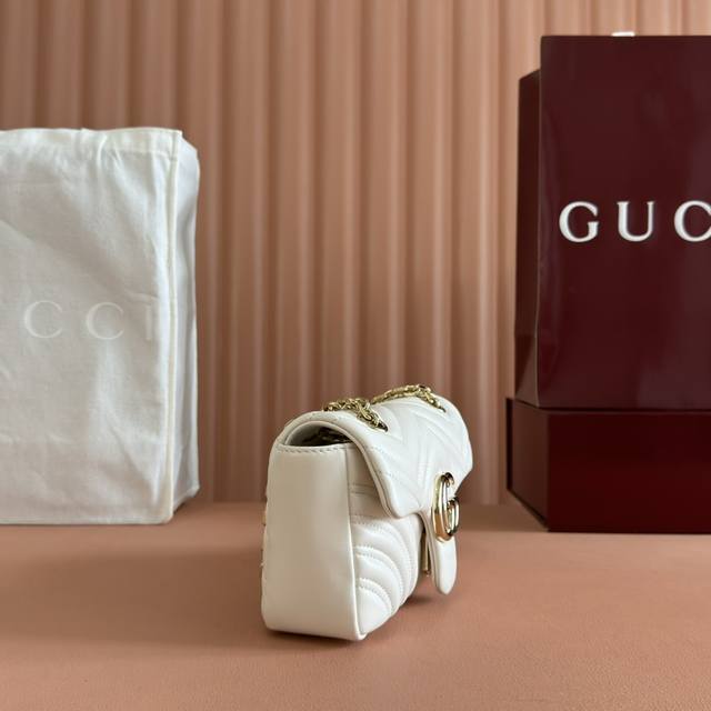 进口原厂羊皮顶级做工、纯铜五金 配置专柜全套包装 品牌标志性Gg Marmont系列匠心融蕴双G造型配件和切面链式包带,甄选柔软皮革缔就线条柔和的包型。 白色V型Matelassé羊皮革 浅金色调配件 古驰安可拉红粘胶纤维衬里 内部:一个开口袋 滑链包带可作为肩带 55厘米高 使用 弹簧扣翻盖 型号:837280。 尺寸:22厘米 宽 X 12.5厘米 高 X 6厘米 深 重量:约0.55千克 颜色:白全皮 原厂皮。 意大利创作