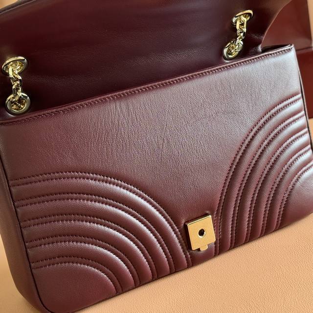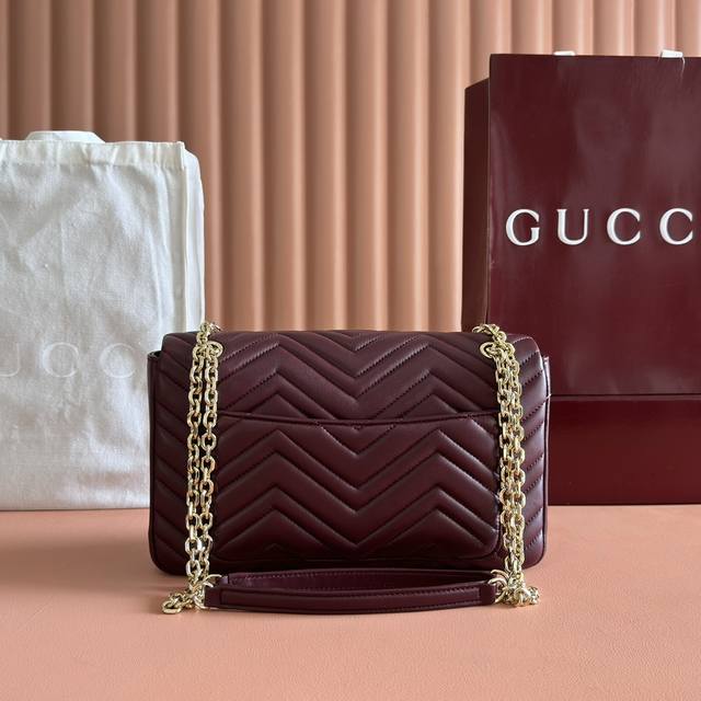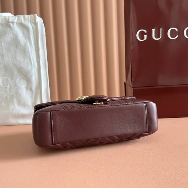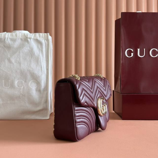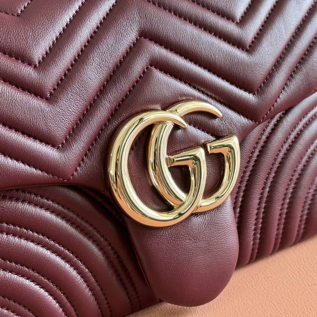 配置专柜全套包装 品牌标志性Gg Marmont系列匠心融蕴双G造型配件和切面链式包带,甄选柔软皮革缔就线条柔和的包型。简约利落的后袋令中号和大号包袋更具实用性。 黑色V型Matelassé羊皮革 浅金色调配件 古驰安可拉红粘胶纤维衬里 内部:一个拉链袋 外部:一个开口袋 滑链包带可作为肩带 35厘米高 或顶部提手 63厘米高 使用;包带长度:164厘米 弹簧扣翻盖 型号:838985。 尺寸:30.5厘米 宽 X 18厘米 高 X 8厘米 深 重量:约0.6千克 颜色:安可色全皮。 意大利创作