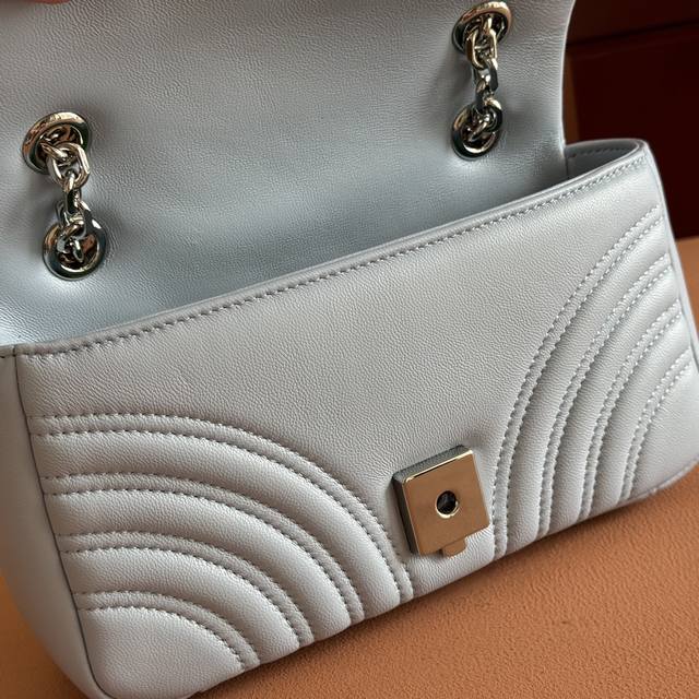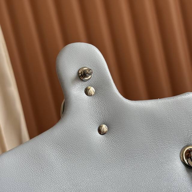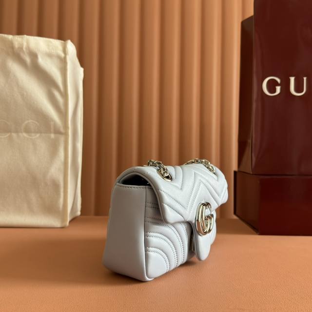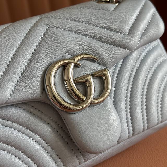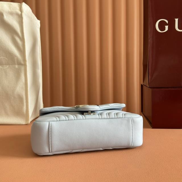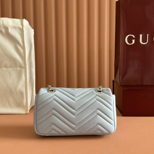 配置专柜全套包装 品牌标志性Gg Marmont系列匠心融蕴双G造型配件和切面链式包带,甄选柔软皮革缔就线条柔和的包型。简约利落的后袋令中号和大号包袋更具实用性。 黑色V型Matelassé羊皮革 浅金色调配件 古驰安可拉红粘胶纤维衬里 双G 内部:一个拉链袋 外部:一个开口袋 滑链包带可作为肩带 56厘米高 使用 弹簧扣翻盖 型号:837267。 尺寸:26厘米 宽 X 15厘米 高 X 7厘米 深 重量:约0.65千克 颜色:蓝全皮 原厂皮。 意大利创作