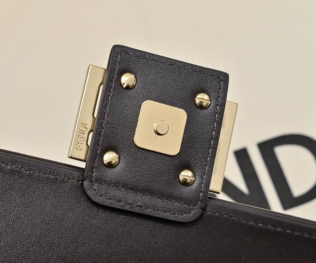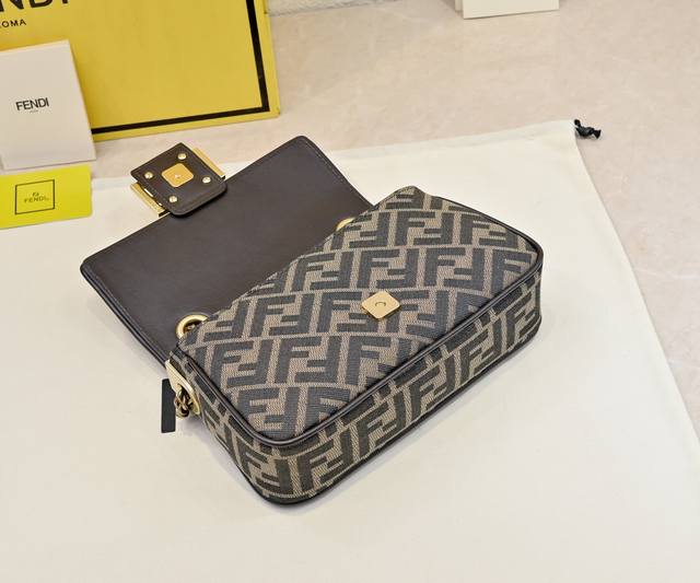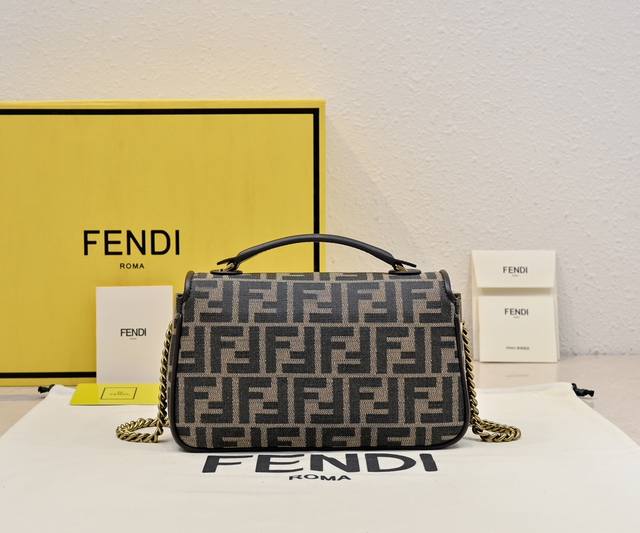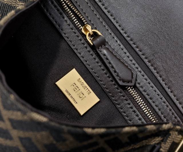 Fendi Baguette手袋,配有滑链肩带,配官网原版双F布料,前幅缀以Ff搭扣。设有正面翻盖、磁扣、带衬里的内部隔层、拉链袋和金色金属件。手腕配头层小牛皮搭配双链条!满足多种需求!可手拿、斜挎或单肩背!