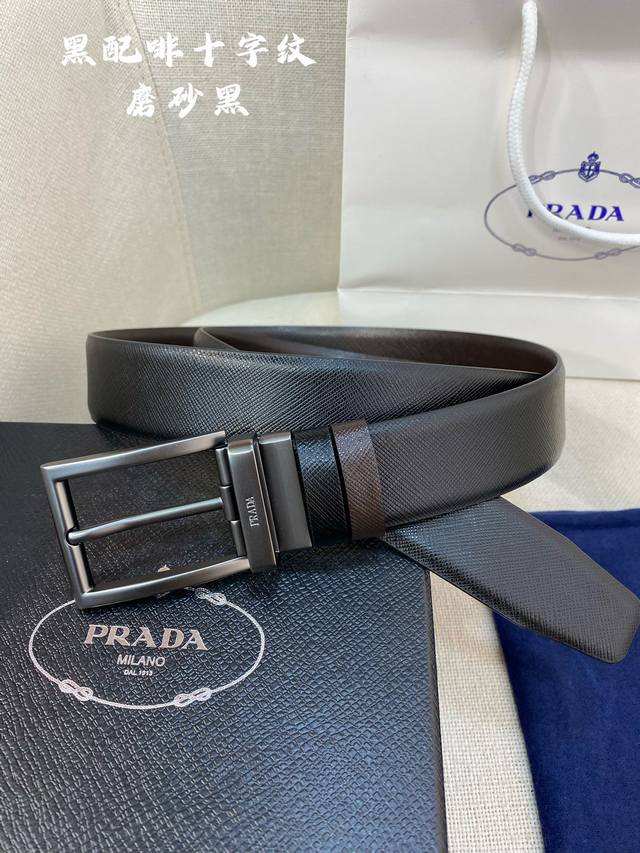 Prada 双面意大利进口头层十字纹牛皮,搭配真空电镀喷砂纯铜针扣,经典款式,专柜有售,市场顶级品质,支持验货 配送全套专柜包装,宽度 3.5Cm