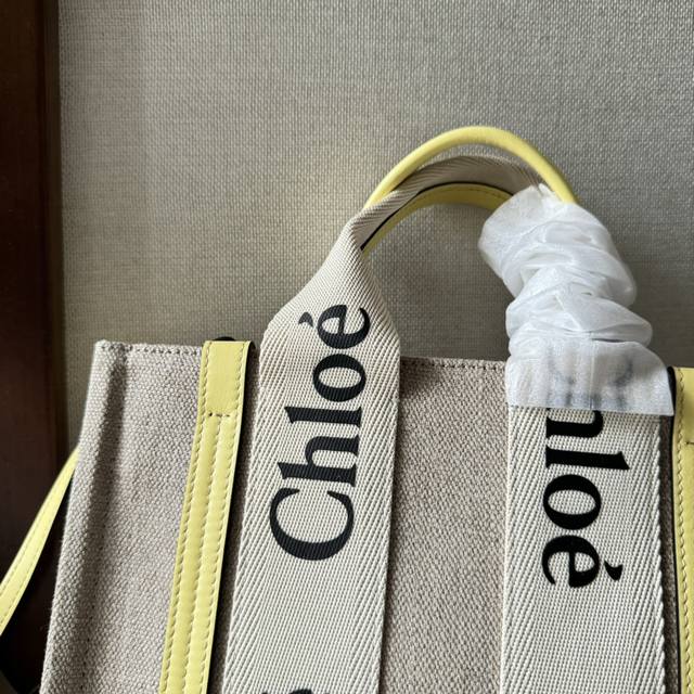 Chloe Woody爆全新升级版上市!!此次改革采用了以环保为主及定型性更加好的亚麻纯棉帆布与亮面小面皮制作而成。包身饰有Chloe丝印字体的白色缎带连贯起整个手袋、与米杏色缎带形成强烈对比的黑白 Chloe Logo背带,是整个包包的亮点。简约小清新的设计充满法式休闲的感觉,有五个尺寸!这款托特包-搭配原版专属礼品袋 蝴蝶结 款号:6062 小号:26.5*20*8Cm