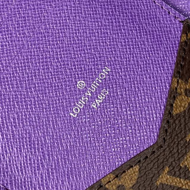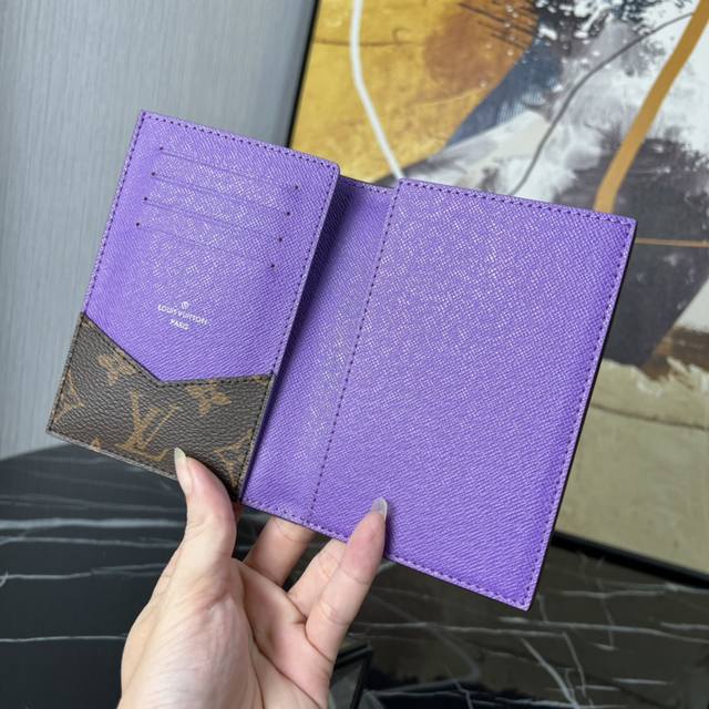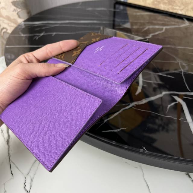 出厂价 顶级原单 M82867 紫色 护照套、本款护照套为 Monogram Macassar 帆布勾勒明亮皮革饰边,织物内衬延续相同色调。实用设计配有贴袋和多重卡片夹层,可妥善存放护照和其他物品。10 X 14 X 2.5 厘米