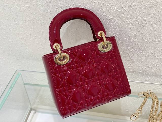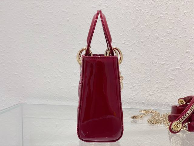 Lady Dior手袋,堪称展现Dior高级订制时装精神的艺术杰作、内里采用羊猄皮、此款手工精心打造的漆皮革手袋饰以Dior经典藤格纹Cannage缝线。可手提亦可肩背,彰显隽永优雅风格。搭配链条肩带