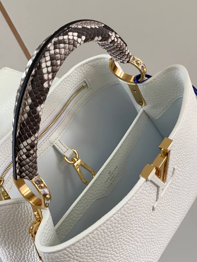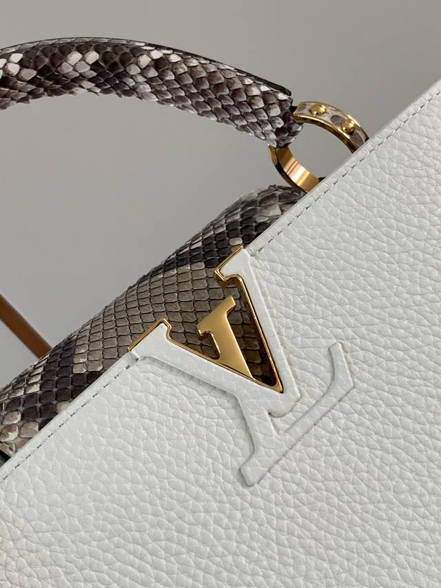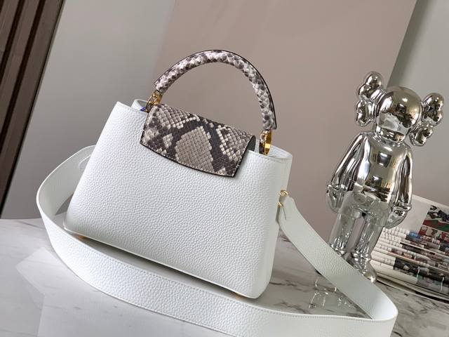 Capucines Bb手袋 法国进口小牛皮,闪亮的金属饰件,特有的Capucines搭盖既可收入包内展示字母标识,又可外翻 呈现Monogram Flower图案 Size:27 X 18 X 9Cm