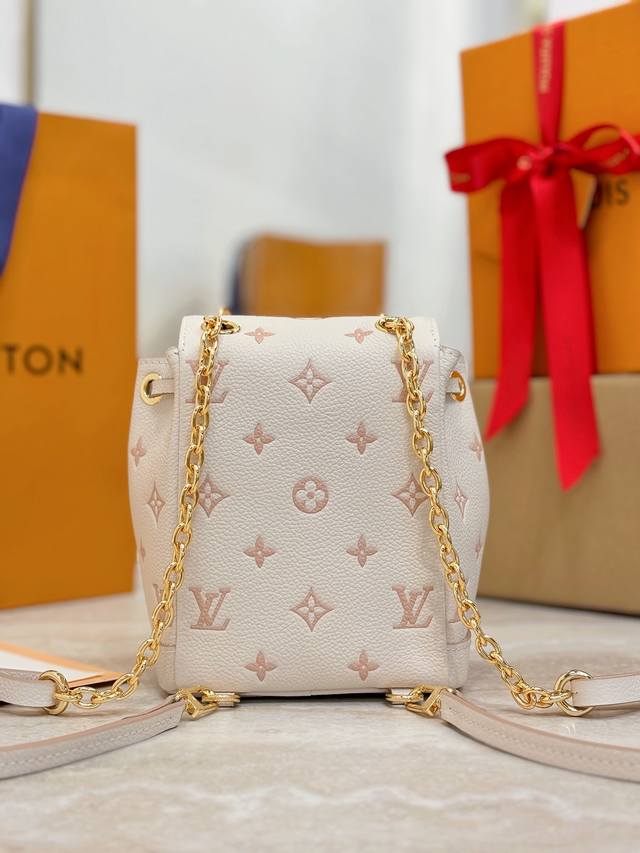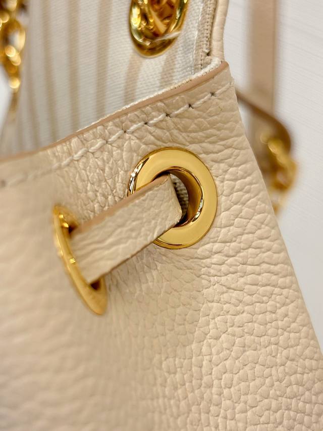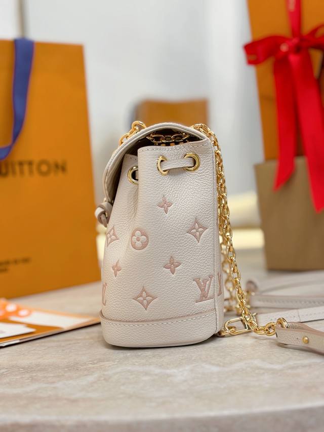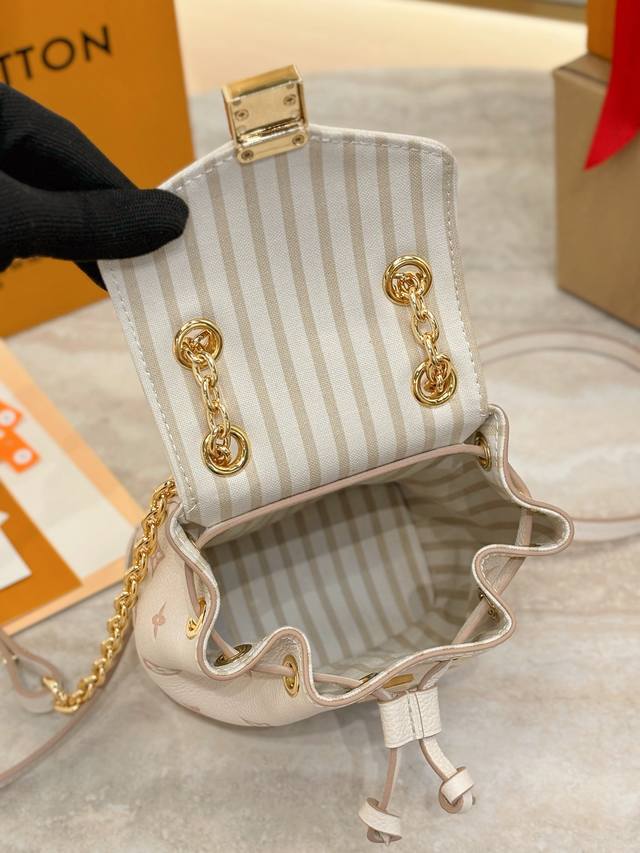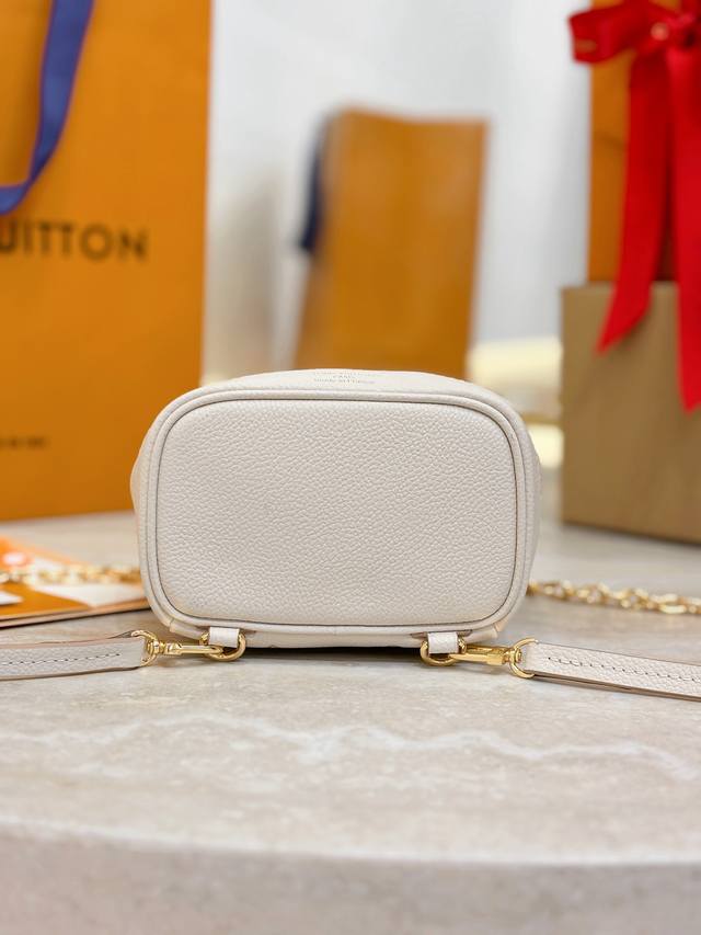 本款 Nano Noé 双肩包为皮革包身浸染双重色调 可轻松点亮昼夜造型 淡雅 Monogram 图案搭配撞色边缘 与耀目链条相得益彰 充裕空间方便收纳手机 唇膏和短款钱夹等日常所需 Size:19X15X10Cm
