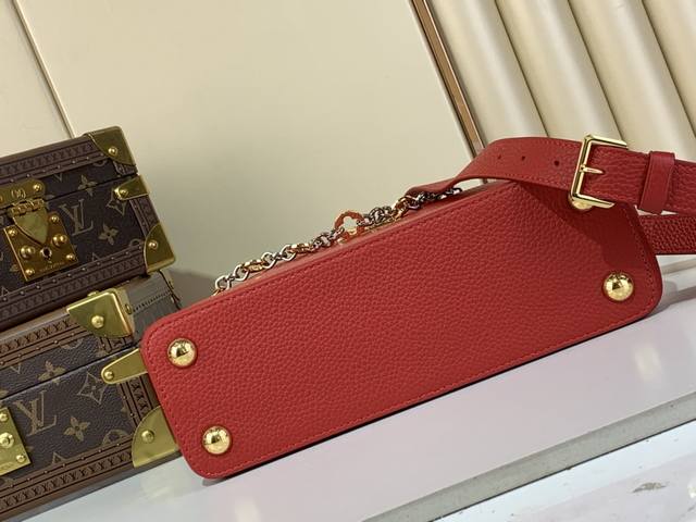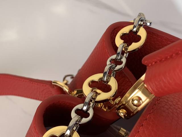 本款 Capucines 中号手袋出自 Chain On You 系列,以 Taurillon 牛皮革聚焦品牌匠心巧思与精良工艺。珠宝风格双镀链条点缀 Monogram 花卉,圆润 Lv 字母和金属件再添考究笔触。无论斜挎、手提或肩背,均可展露优雅格调。