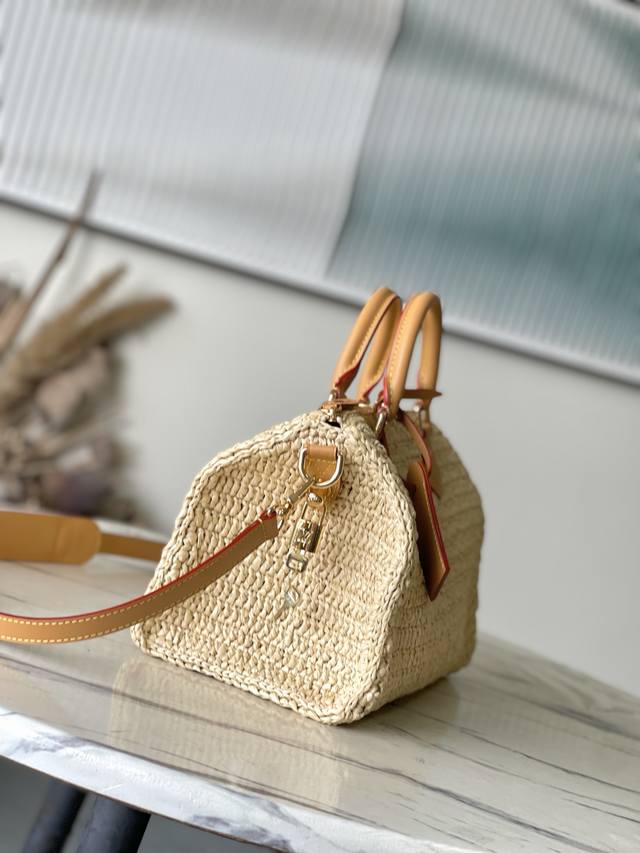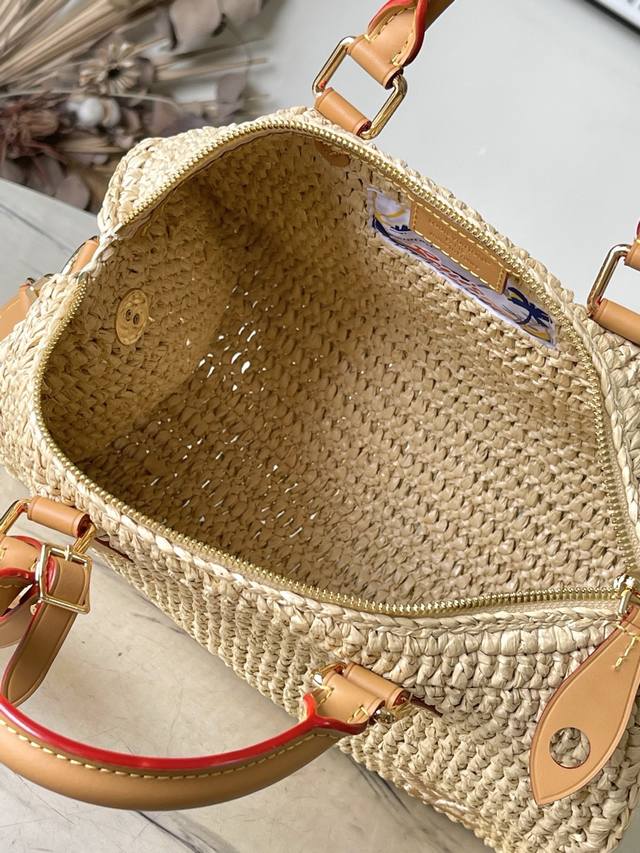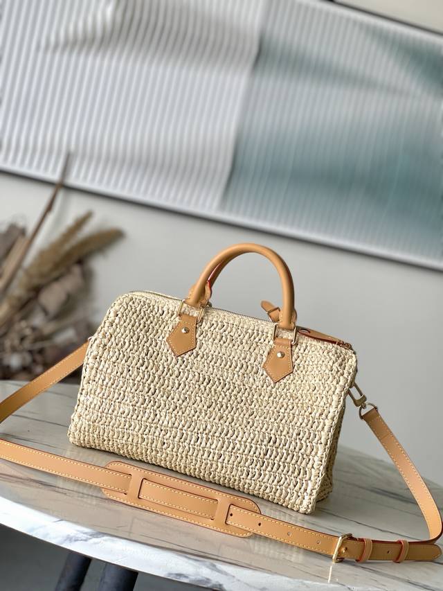 / 顶级原单 M14457 本款Speedy 30 Bandouliere手袋取材拉菲草,以精湛匠艺赋予每件成品别样风采,再借做旧牛皮革增添复古韵味。Lv字母刺绣栖