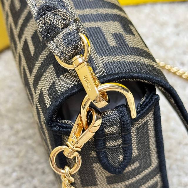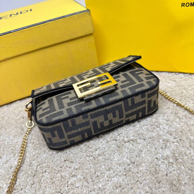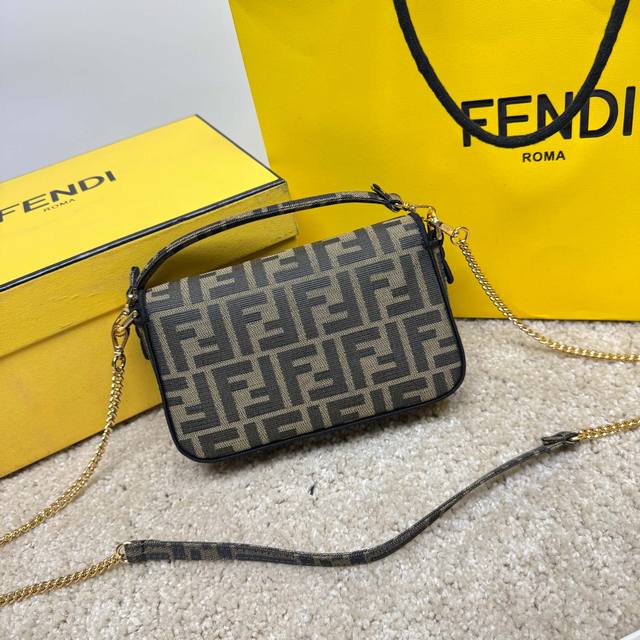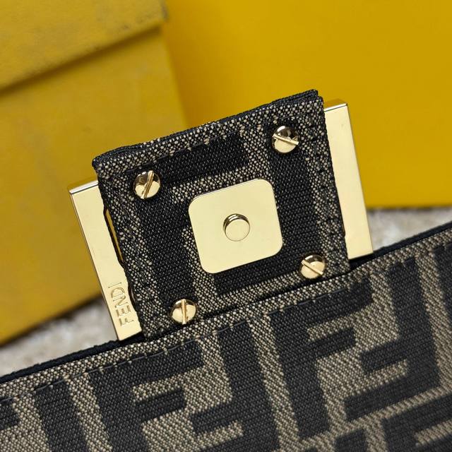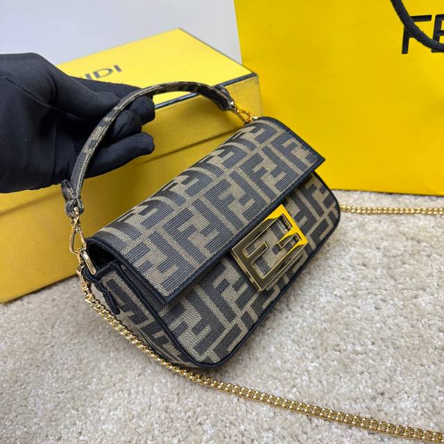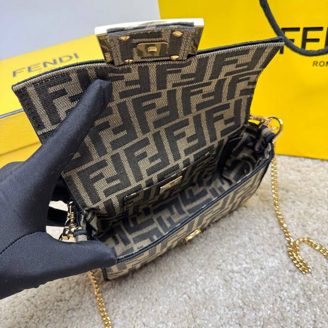 / Fend1标志性的Baguette中号手袋采用翻盖设计配有 Ff 磁扣,内衬配有拉链袋。配备可拆卸肩带可手提或斜挎。布料材质,饰有提 Ff 图案饰有粉色缎面针脚