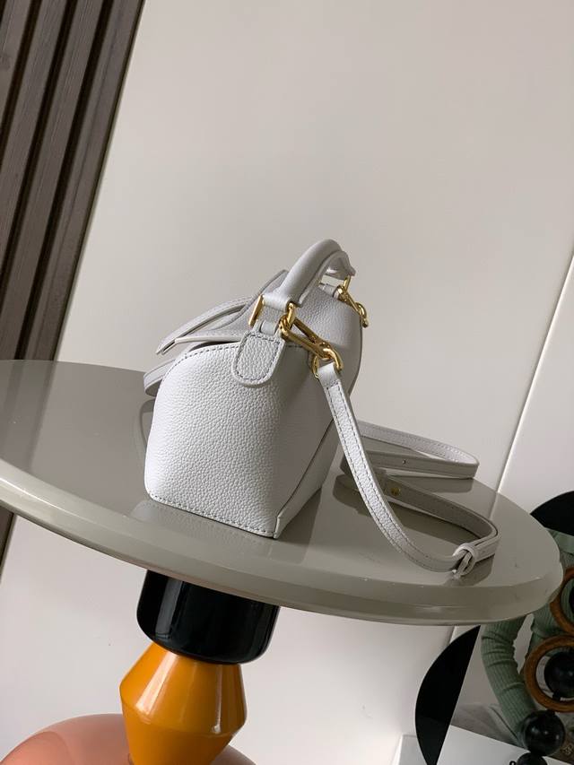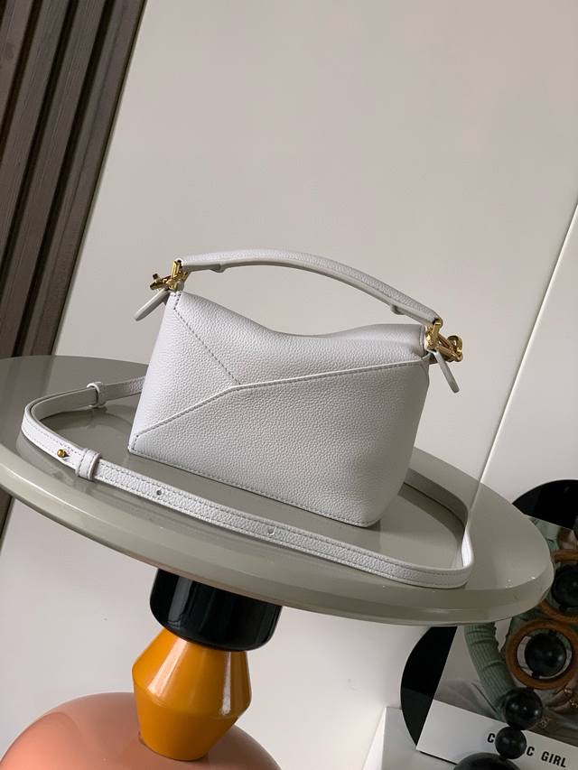 爆款新版本几何包迷你18Cm原厂进口荔枝纹小牛皮Puzzle手袋是创意总监乔纳森.安德森为 L0Ewe 推出的首款手提包长方体形状和精确的切割技术创造了 Puzzle 独特的几何线条。这个迷你版本采用经典牛皮革制成迷你 Puzzle 可以容纳例如一只小号垂直钱包、大多数尺寸的手机 最大6.1英寸 和太阳镜盒斜挎、肩背、手拿或顶部提手携带.可拆卸肩带包包自身重量几乎忽略,炒鸡实用,出门装手机小钱包口红粉饼,毫无累赘感,轻松愉快人生从此开启 你们最关心的Xs,Plus都Ok哈