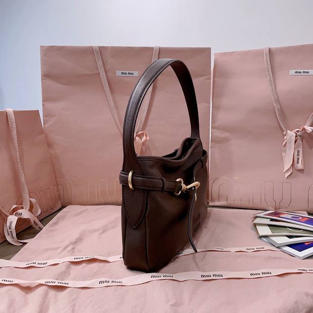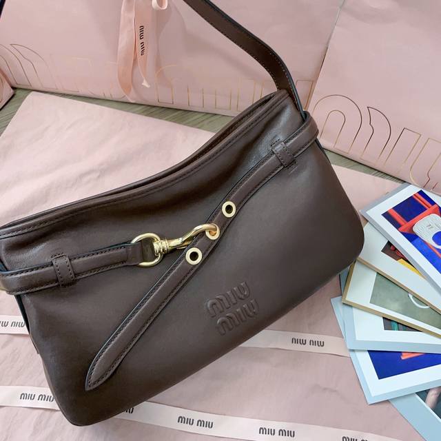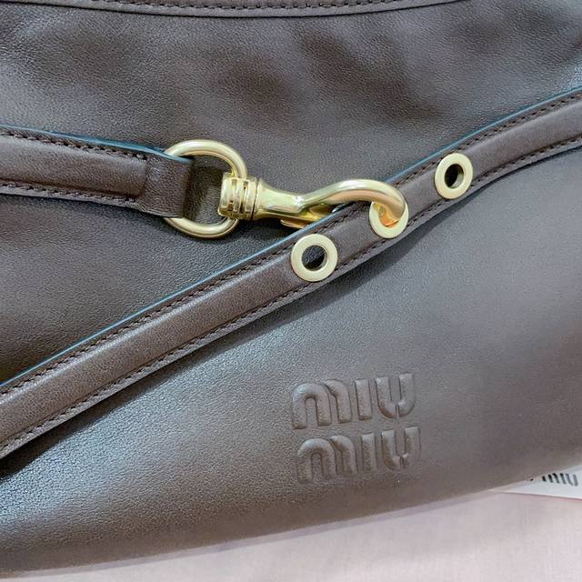 【缪家】新品爆款腋下中古包5Bc182,采用全新柔脂羊皮,皮质柔软高级,这款Aventure 皮革手袋灵感源自09年Miu典藏设计,结构经过调整,重新诠释独特造型,焕发全新个性,饰以压花字母徽标,增添标志性元素,复古金色五金配件,亚麻混纺衬里,内配拉链口袋,长手腕适合用作手提或单肩,尺寸:33X19X5Cm
