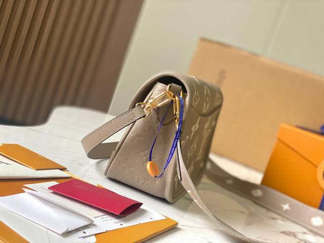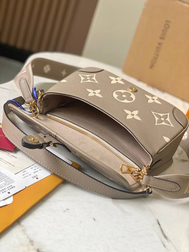 本款 Diane 手袋取材路易威登经典 Monogram Empreinte 压纹皮革,将品牌标识织入可拆卸宽幅提花肩带,在可拆卸皮革肩背带之外再添斜挎选择,灵活契合优雅格调或动感风尚。详细特征:23.0 X 16.0 X 8.5 厘米