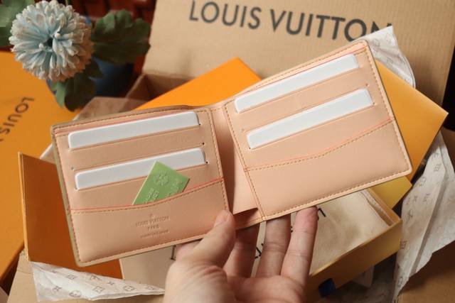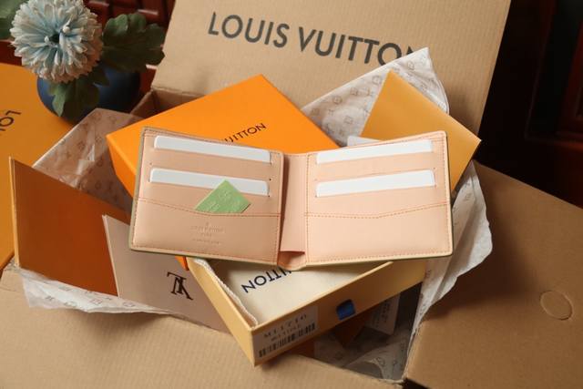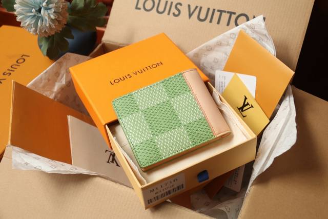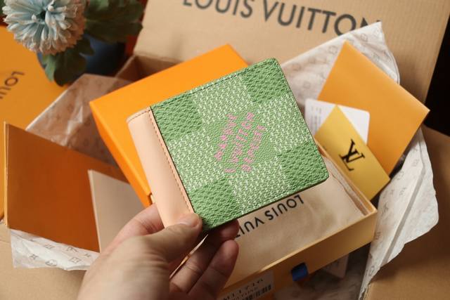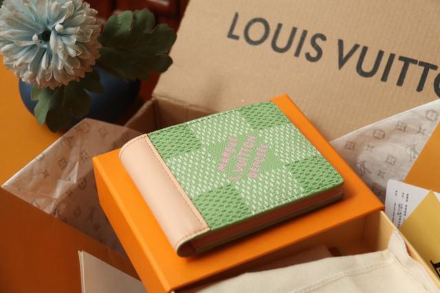 本款 Slender 钱夹为 Damier Golf 涂层帆布搭配牛皮革饰边,见证品牌与 Tyler 的联袂创意。明丽棋盘格图案与 L.Vuitton Marque DéPoséE 标识相映成趣,设有卡片夹层和钞票隔层。11 X 8.5 X 2 厘米 (长度 X 高 X 宽)。