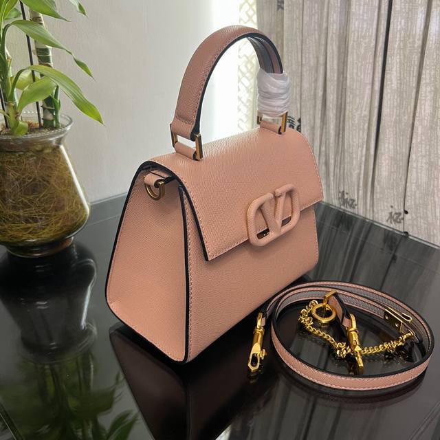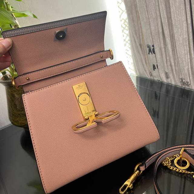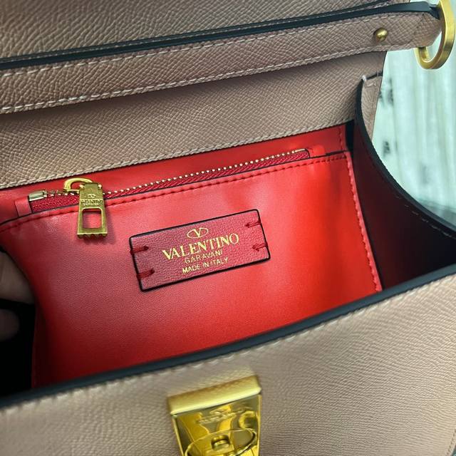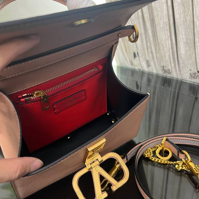 皮扣 Garavani Vsling 手掌纹职业公文包搭配可延长拼色肩带及手柄,肩背、斜挎和手提切换自如。 复古做旧黄铜金属配件 ,磁扣开合,搭配标志性Logo 可调节链饰皮革肩带 ,包底护脚 ,纳帕皮革衬里。内部:2 个隔层,穿插 1 个拉链口袋和 1 个扁平开袋