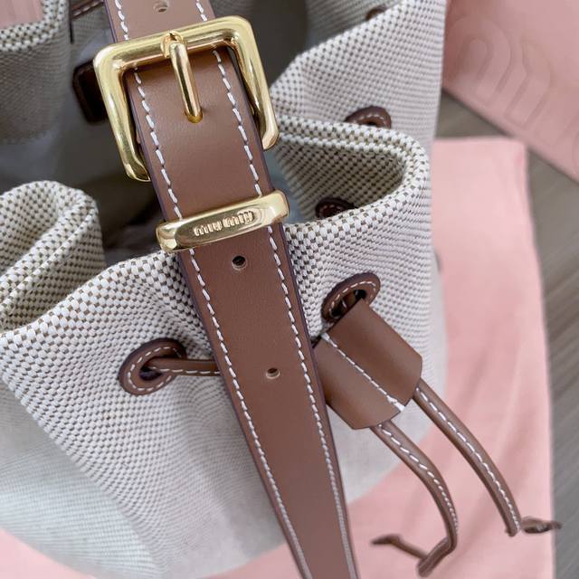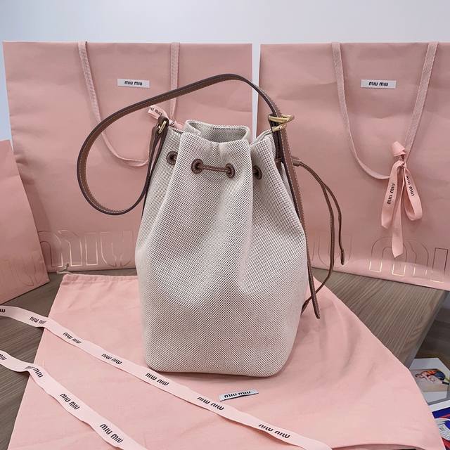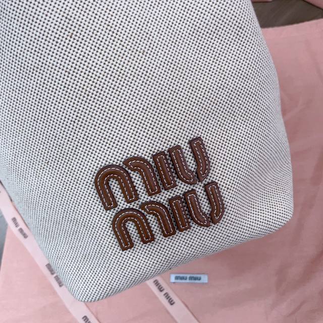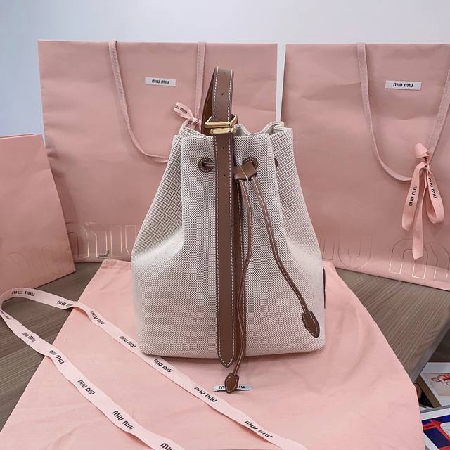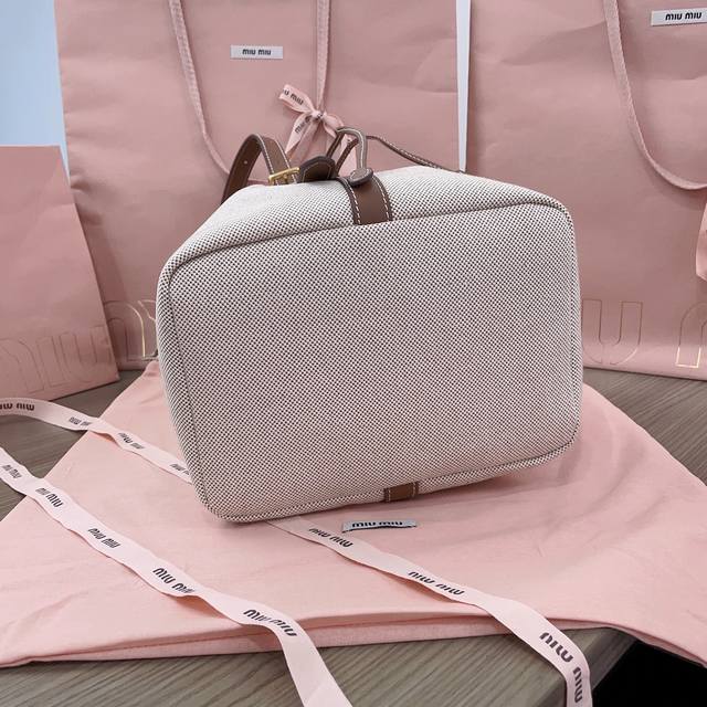 5Be089,Miu家新款帆布水桶包,全新帆布面料,延续上一季的慵懒和性感热潮,又一火爆款式,搭配顶级进口小牛皮,皮面细腻光滑柔软,上乘的皮革质感高级,包体休闲轻盈,包身软而有型,肩带可调节设计,更加精致实用,好气质随性慵懒,日常出街背它回头率百分百,手工缝制皮面Logo标志,内里全新麻布里,尺寸23X 29X17Cm,配原版包装