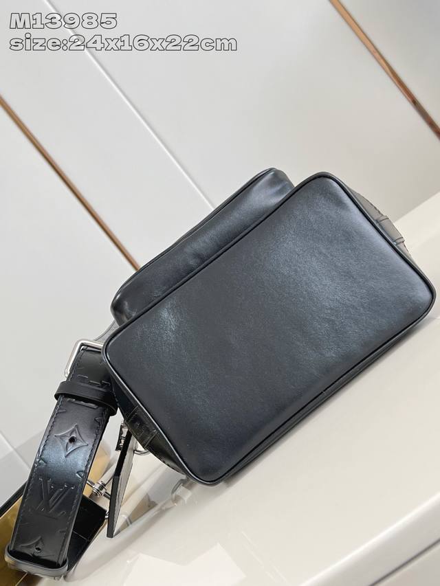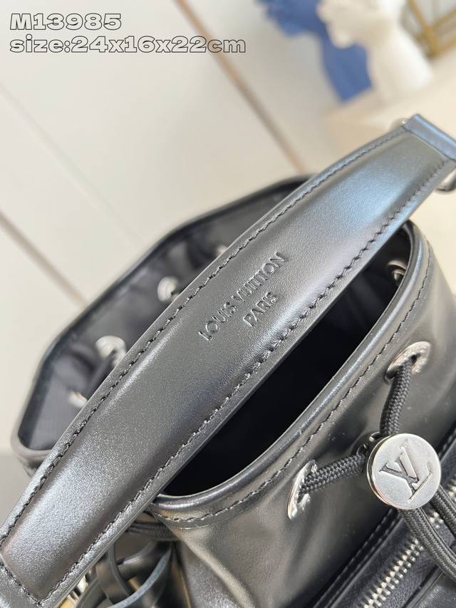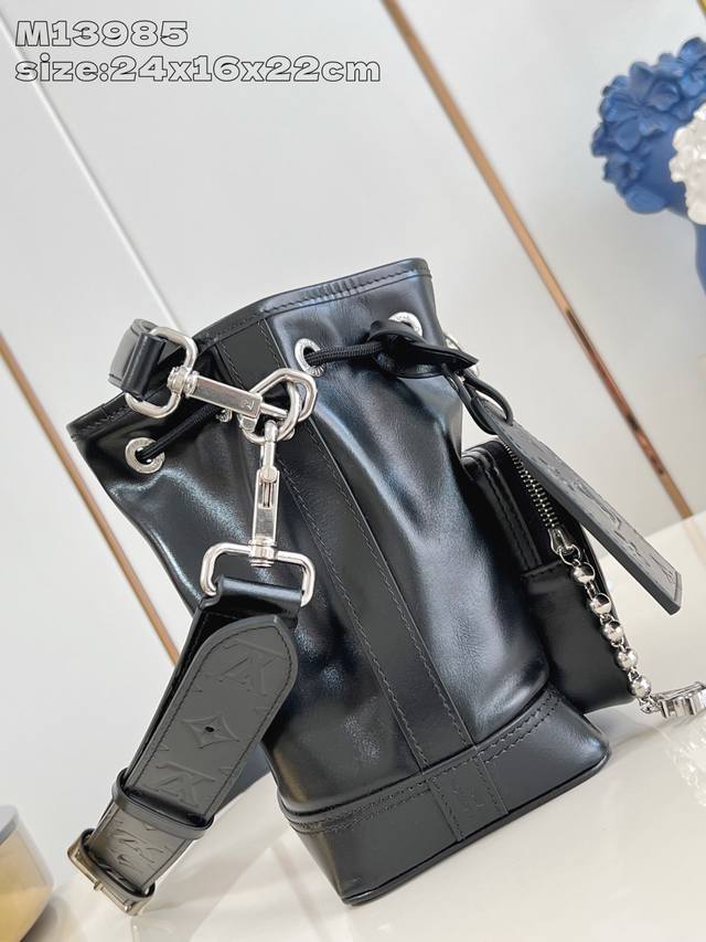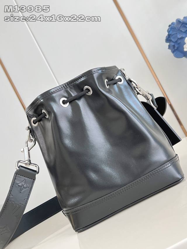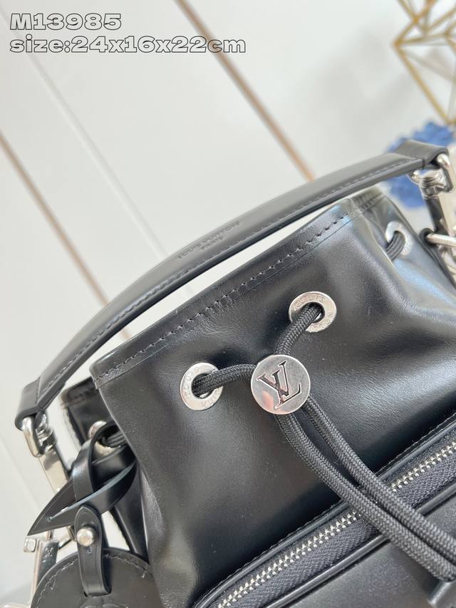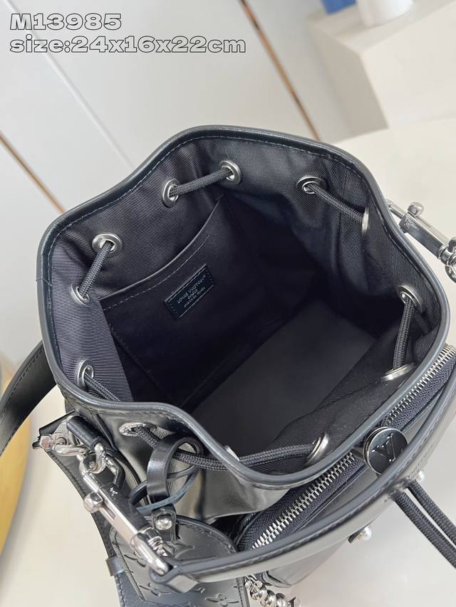 / 出厂价P 顶级原单 M13985 本款 Noé Cargo 小号水桶包为牛皮革注入锦纶般的炫目光泽,以金属 Lv 字母和珠链点亮细节,搭配宽敞前袋和织物内衬。2