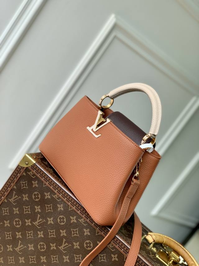 这款Capucines 小号通过这种精致的三色设计进行了季节性更新。采用Taurillon皮革制成,可以内翻或外翻翻盖,并以金色色调的Lv标志作为点缀。手柄提供了足够的空间,可以佩戴在肘部弯曲处,但由于可拆卸的肩带,也可以斜挎。