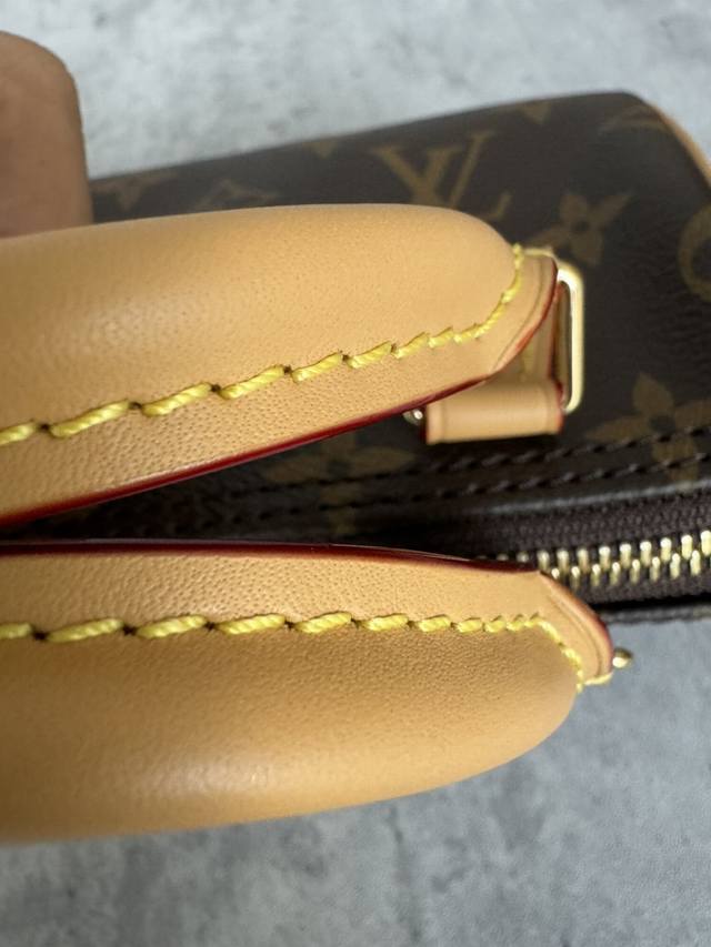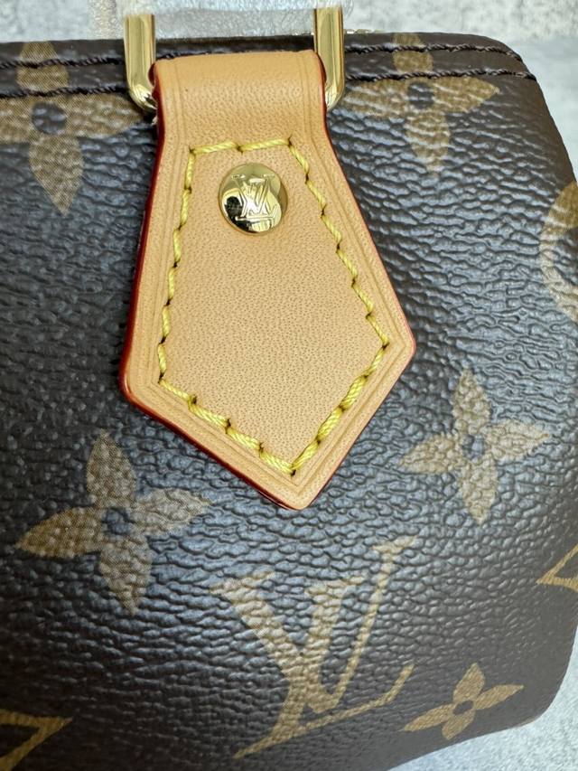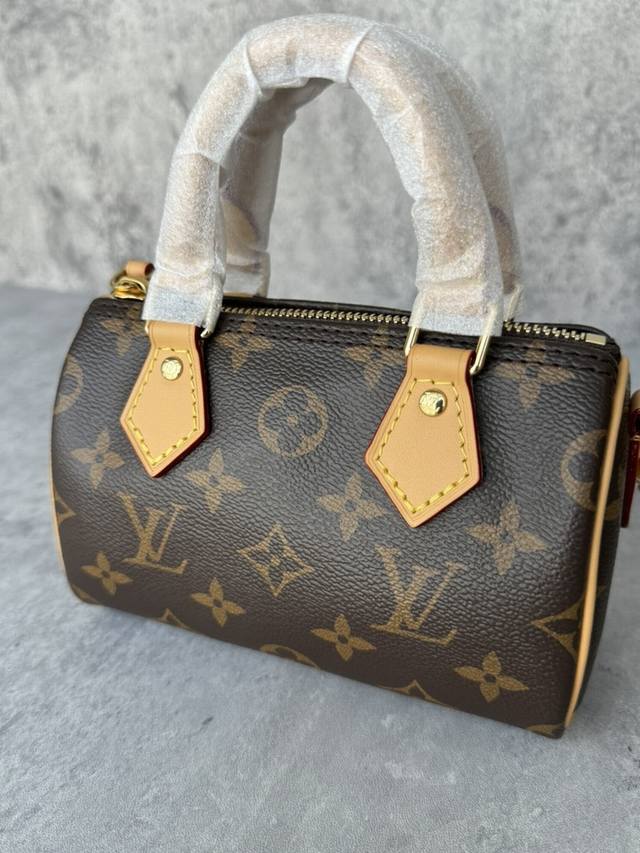 Nano Speedy 手袋浓缩路易威登经典 Speedy 手袋构型,以 Monogram 帆布塑造玲珑设计,搭配做旧牛皮革细节和金属件。