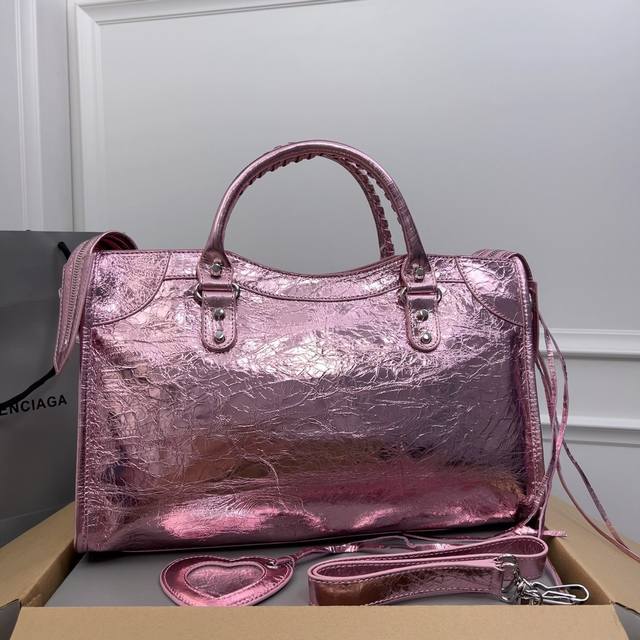 巴黎世家机车 银粉色 爆裂纹进口羊皮 ,Classic Gold City Black 意大利原厂进口爆裂纹羊皮,皮纹爆裂,皮有香味,超流行平钉银扣皮拉头,独家现货供应 ,大号Size:38*24*14Cm,全网最高版本