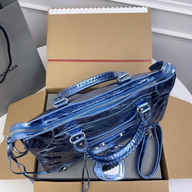 巴黎世家机车 顶级好货。金属蓝 爆裂纹进口羊皮 ,Classic Gold City Black 意大利原厂进口爆裂纹羊皮,皮纹爆裂,皮有香味,超流行平钉银扣皮拉头,独家现货供应 ,大号Size:38*24*14Cm,全网最高版本