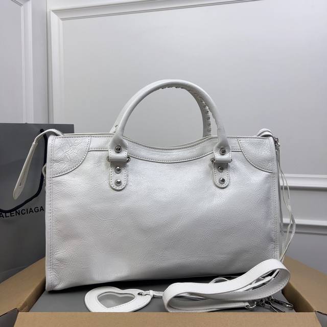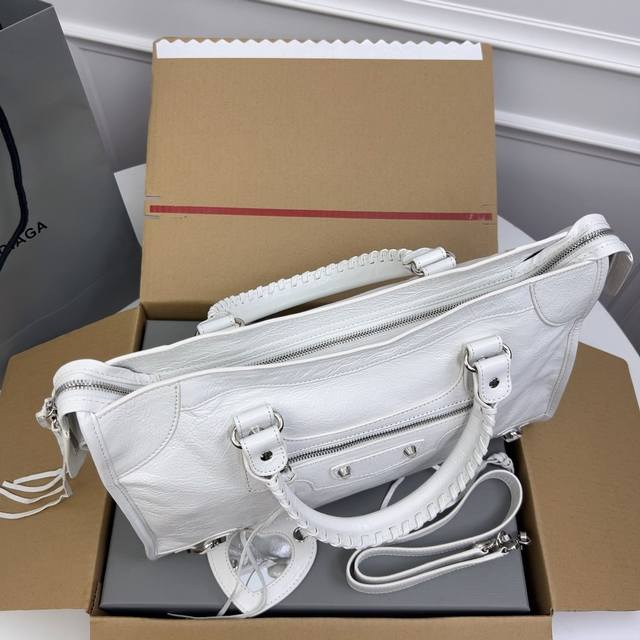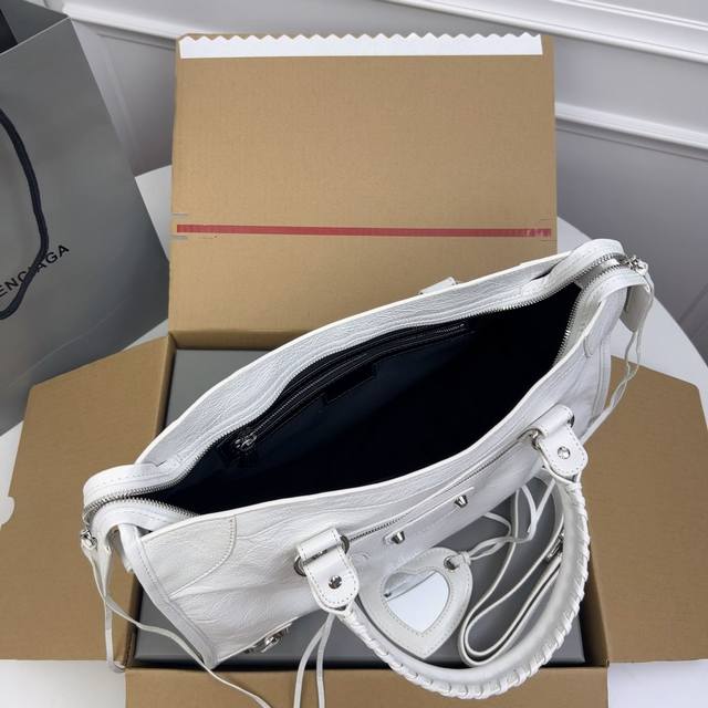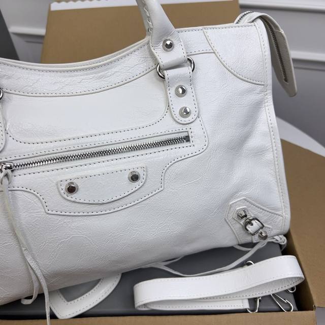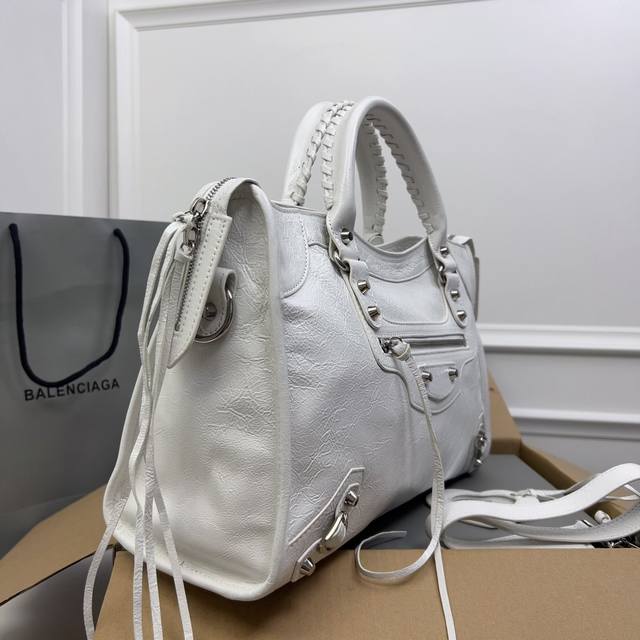 巴黎世家机车 顶级好货。白色 爆裂纹进口羊皮 ,Classic Gold City Black 意大利原厂进口爆裂纹羊皮,皮纹爆裂,皮有香味,超流行平钉银扣皮拉头,独家现货供应 ,大号Size:38*24*14Cm,全网最高版本