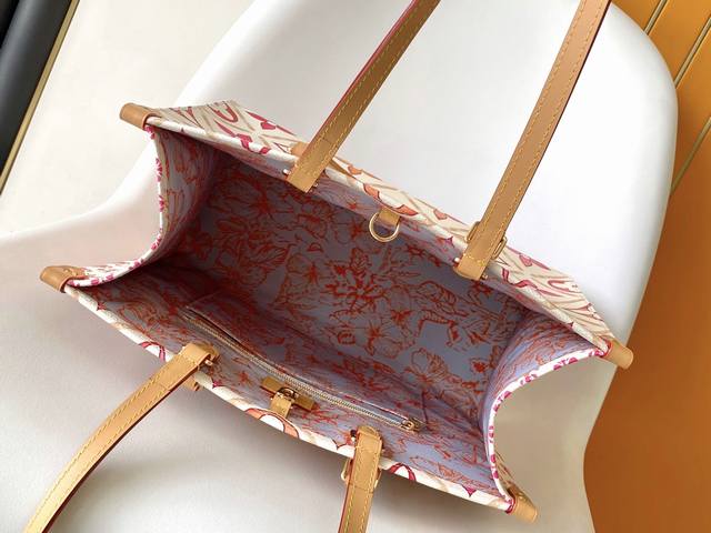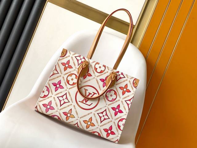 M11262蓝色 M11265红色 顶级原单 本款 Onthego 中号托特包以 Monogram Tiles 帆布展现水彩效果 Monogram 印花,令 Lv Circle 标识点睛中央。牛皮革裁出手柄与隐藏式肩带,铆钉栖身角落袢带,充裕构型可收纳笔记本电脑和日常所需。